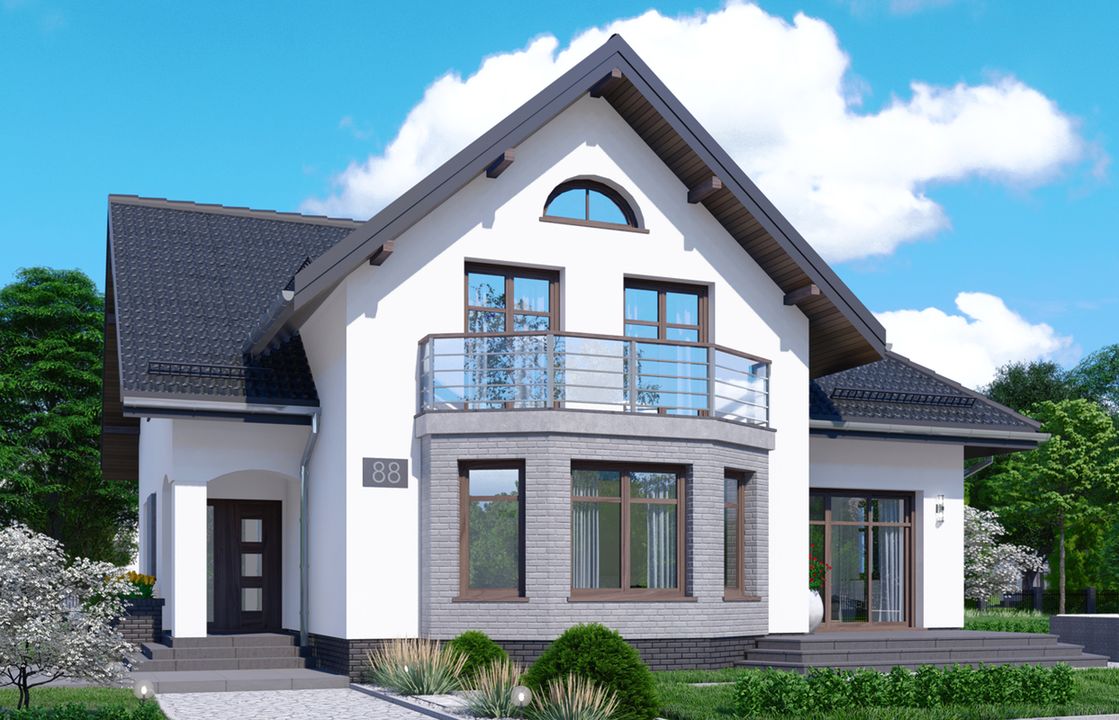 Graficzne opracowanie rzutów poglądowych widocznych na karcie projektu zostało wykonane przez Extradom.pl. Prezentowane przez Extradom.pl wizualizacje wykonane zostały przez autora projektu i należy poczytywać je jedynie za przykład i propozycję wykończenia, wizję architektoniczną autora projektu. Ostateczne wykończenie budynku może nastąpić na wiele sposobów. Szczegółowe rozwiązania zastosowane w oferowanej dokumentacji - w tym również ilość, lokalizacje i wygląd okien, drzwi, kominów - mogą w niewielkim stopniu różnić się od prezentowanej wizualizacji budynku.