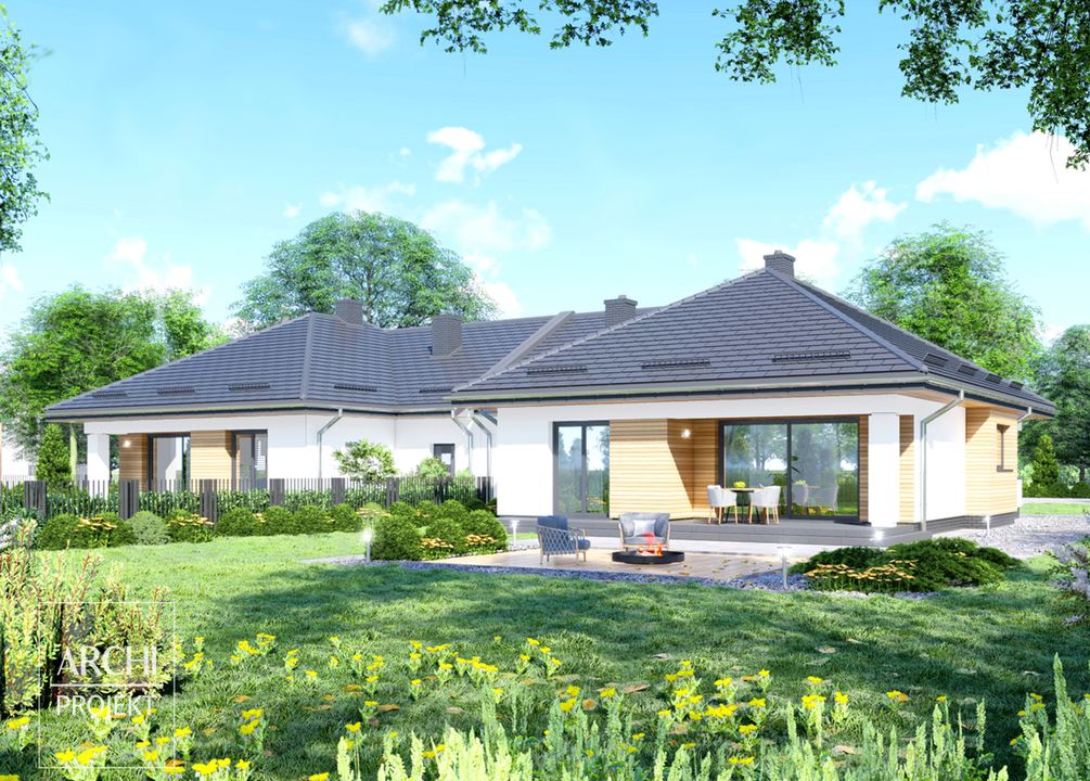 Graficzne opracowanie rzutów poglądowych widocznych na karcie projektu zostało wykonane przez Extradom.pl. Prezentowane przez Extradom.pl wizualizacje wykonane zostały przez autora projektu i należy poczytywać je jedynie za przykład i propozycję wykończenia, wizję architektoniczną autora projektu. Ostateczne wykończenie budynku może nastąpić na wiele sposobów. Szczegółowe rozwiązania zastosowane w oferowanej dokumentacji - w tym również ilość, lokalizacje i wygląd okien, drzwi, kominów - mogą w niewielkim stopniu różnić się od prezentowanej wizualizacji budynku.