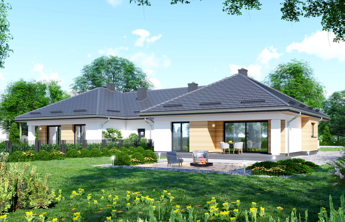 Graficzne opracowanie rzutów poglądowych widocznych na karcie projektu zostało wykonane przez Extradom.pl. Prezentowane przez Extradom.pl wizualizacje wykonane zostały przez autora projektu i należy poczytywać je jedynie za przykład i propozycję wykończenia, wizję architektoniczną autora projektu. Ostateczne wykończenie budynku może nastąpić na wiele sposobów. Szczegółowe rozwiązania zastosowane w oferowanej dokumentacji - w tym również ilość, lokalizacje i wygląd okien, drzwi, kominów - mogą w niewielkim stopniu różnić się od prezentowanej wizualizacji budynku.