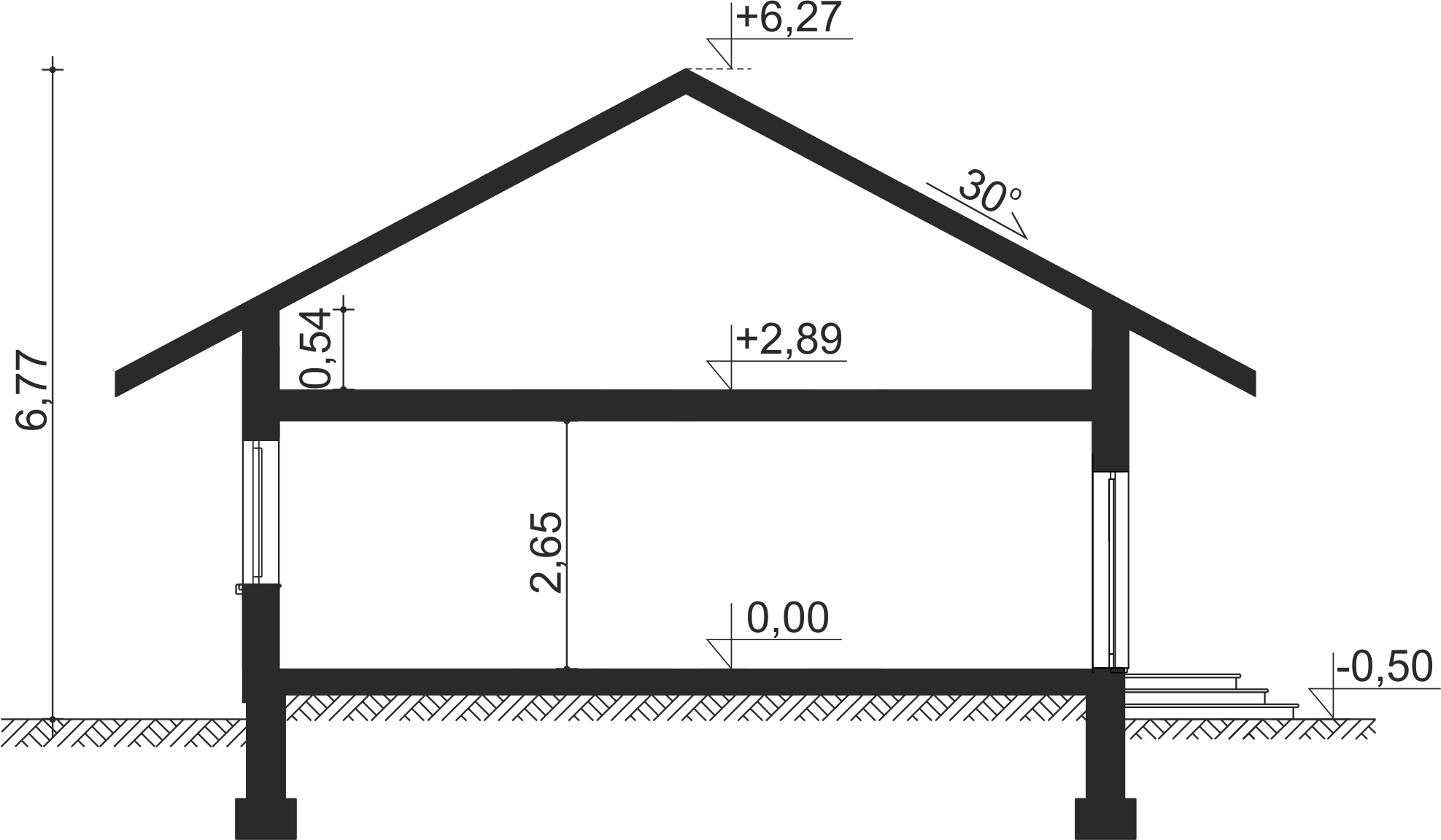 Ściany: bloczki z betonu komórkowego + ocieplenie. Strop parteru: typu TERIVA. Strop poddasza: drewniany. Dach: drewniany, wielospadowy. Pokrycie dachu: dachówka lub blacha. Ocieplenie poddasza: wełna mineralna ROCKWOOL. Tynk: mineralny.