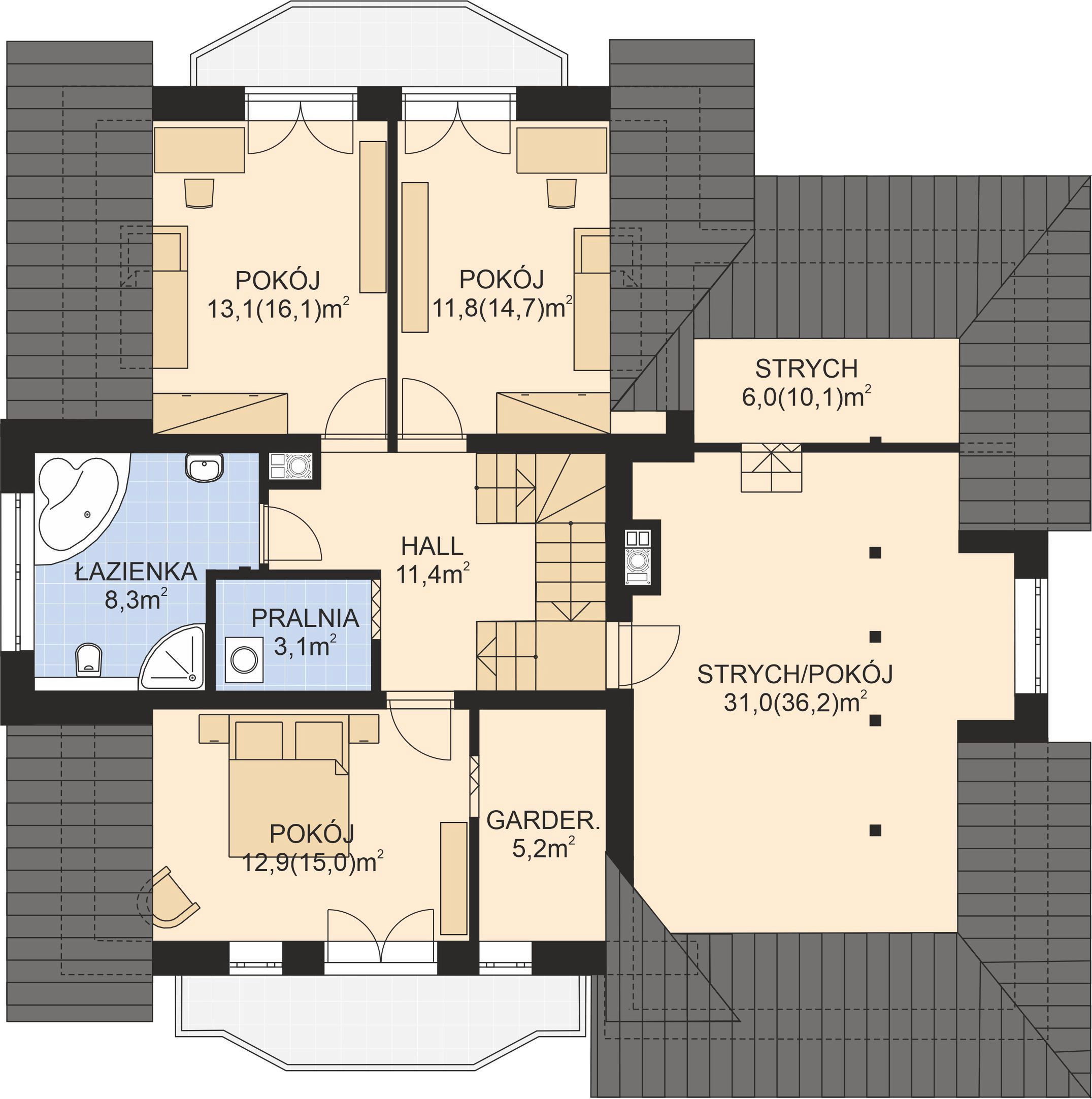Na poddaszu zaprojektowano prywatną strefę odpoczynku dla domowników. Zapewnia ona ciszę i komfortowe warunki do regeneracji. Znajdują się tu: