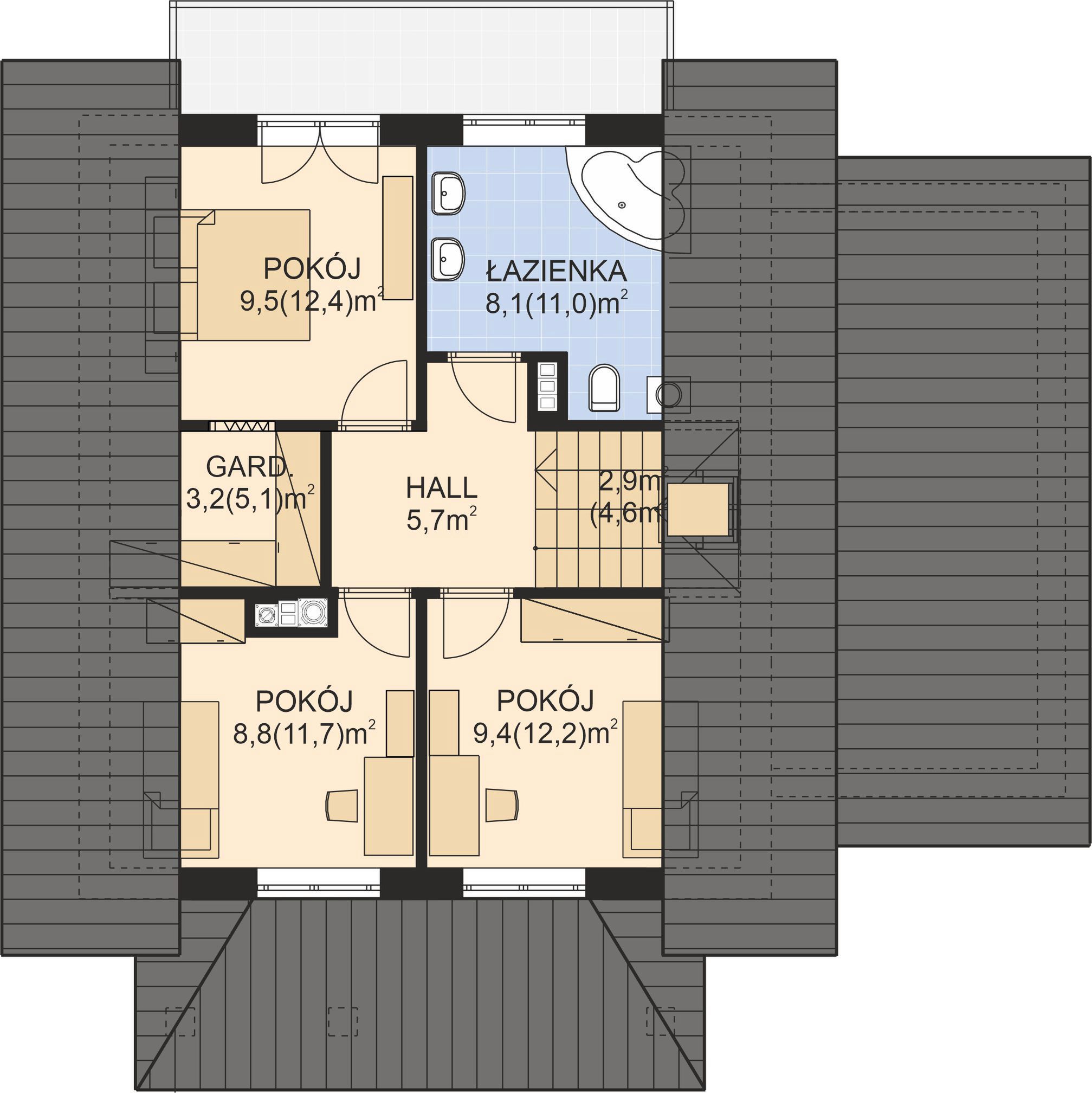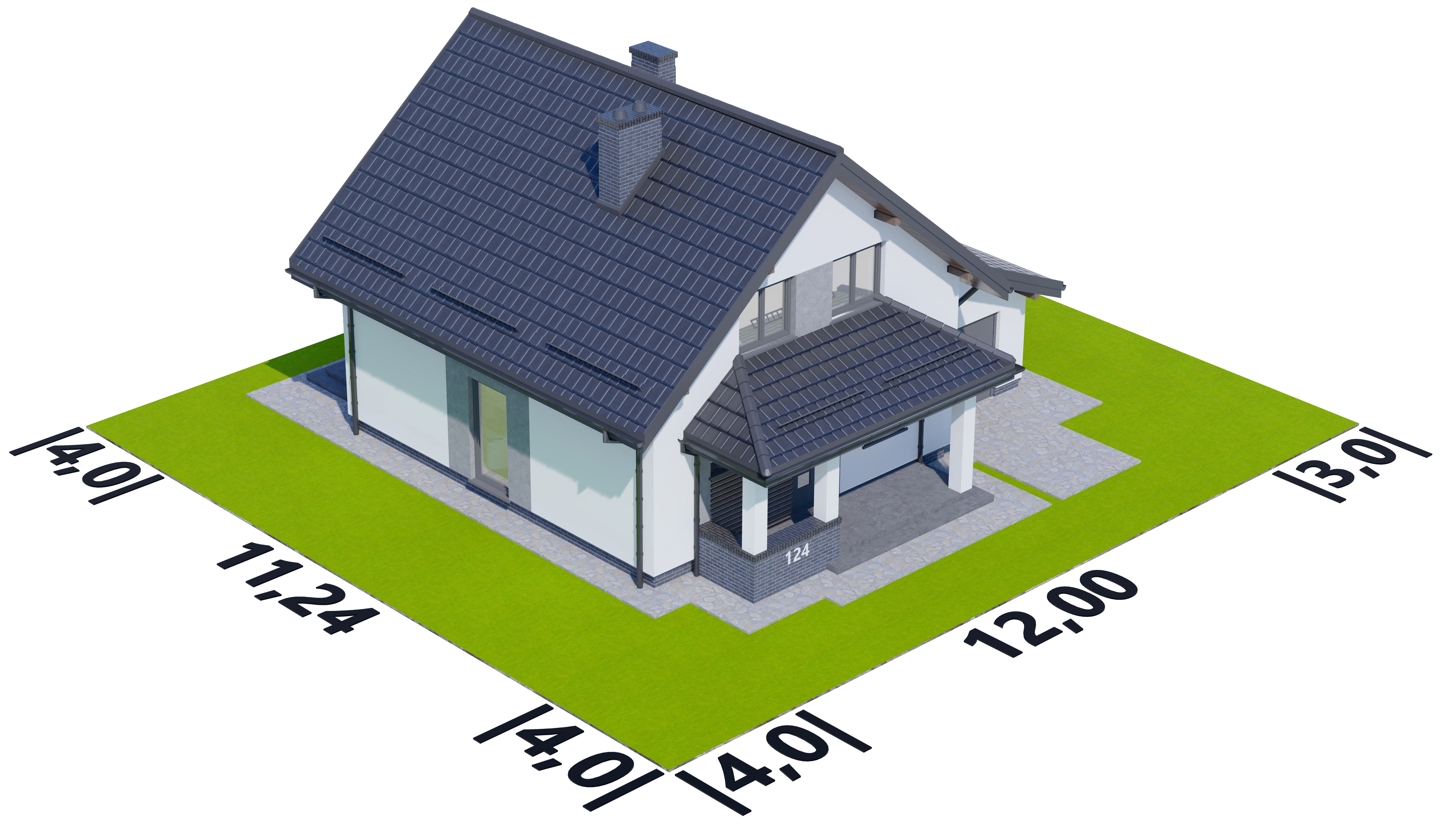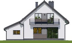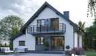 Graficzne opracowanie rzutów poglądowych widocznych na karcie projektu zostało wykonane przez Extradom.pl. Prezentowane przez Extradom.pl wizualizacje wykonane zostały przez autora projektu i należy poczytywać je jedynie za przykład i propozycję wykończenia, wizję architektoniczną autora projektu. Ostateczne wykończenie budynku może nastąpić na wiele sposobów. Szczegółowe rozwiązania zastosowane w oferowanej dokumentacji - w tym również ilość, lokalizacje i wygląd okien, drzwi, kominów - mogą w niewielkim stopniu różnić się od prezentowanej wizualizacji budynku.