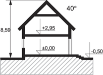 Ściany: bloczki z betonu komórkowego + ocieplenie. Strop parteru: typu „TERIVA”. Strop poddasza: drewniany. Dach: dwuspadowy, kąt nachylenia 40 st.. Pokrycie dachu: dachówka lub blacha. Ocieplenie poddasza: wełna mineralna Rockwool. Tynk: mineralny.