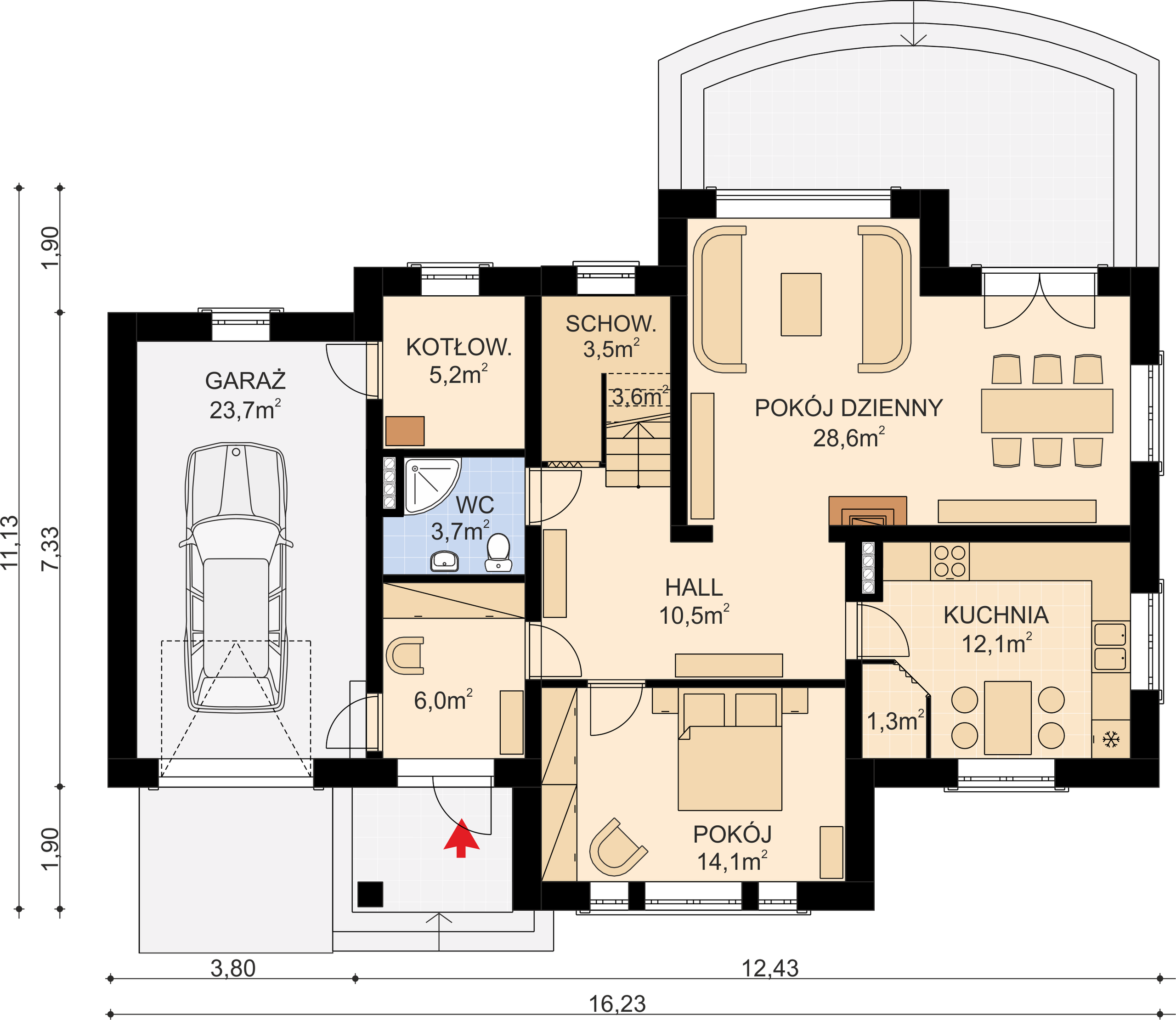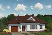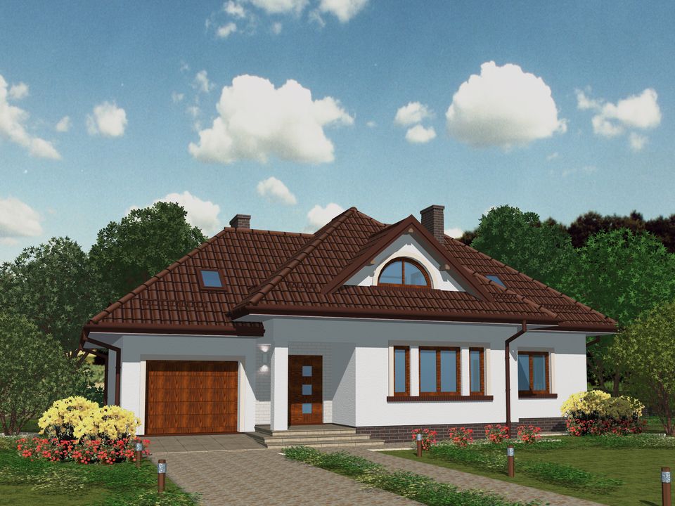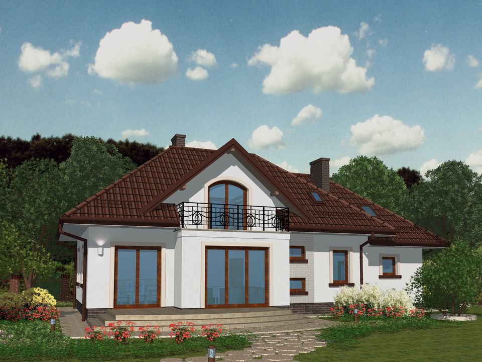 Graficzne opracowanie rzutów poglądowych widocznych na karcie projektu zostało wykonane przez Extradom.pl. Prezentowane przez Extradom.pl wizualizacje wykonane zostały przez autora projektu i należy poczytywać je jedynie za przykład i propozycję wykończenia, wizję architektoniczną autora projektu. Ostateczne wykończenie budynku może nastąpić na wiele sposobów. Szczegółowe rozwiązania zastosowane w oferowanej dokumentacji - w tym również ilość, lokalizacje i wygląd okien, drzwi, kominów - mogą w niewielkim stopniu różnić się od prezentowanej wizualizacji budynku.