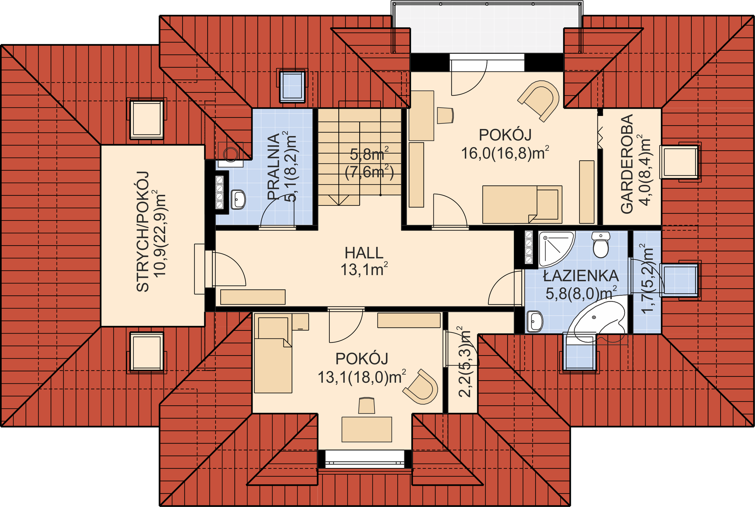 Ściany: POROTHERM. Strop parteru: typu „TERIVA”. Strop poddasza: drewniany. Dach: dwuspadowy, kąt nachylenia 40 st.. Pokrycie dachu: dachówka lub blacha. Ocieplenie poddasza: wełna mineralna Rockwool. Tynk: mineralny. Okna dachowe: Velux.