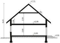 Ściany: pustaki ceramiczne + ocieplenie TERMOORGANIKA. Strop parteru: typu TERIVA. Strop poddasza: drewniany. Dach: drewniany, dwuspadowy. Pokrycie dachu: dachówka lub blacha. Ocieplenie poddasza: wełna mineralna ROCKWOOL. Tynk: mineralny. Okna dachowe: VELUX.