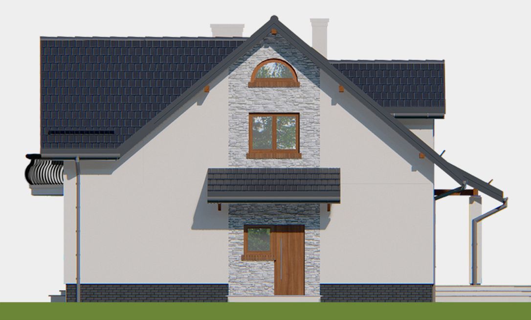 Graficzne opracowanie rzutów poglądowych widocznych na karcie projektu zostało wykonane przez Extradom.pl. Prezentowane przez Extradom.pl wizualizacje wykonane zostały przez autora projektu i należy poczytywać je jedynie za przykład i propozycję wykończenia, wizję architektoniczną autora projektu. Ostateczne wykończenie budynku może nastąpić na wiele sposobów. Szczegółowe rozwiązania zastosowane w oferowanej dokumentacji - w tym również ilość, lokalizacje i wygląd okien, drzwi, kominów - mogą w niewielkim stopniu różnić się od prezentowanej wizualizacji budynku.