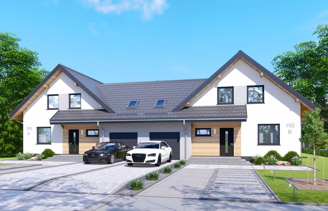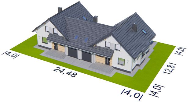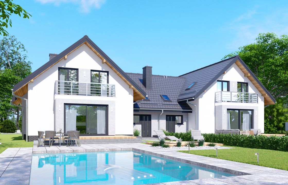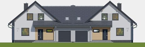 Graficzne opracowanie rzutów poglądowych widocznych na karcie projektu zostało wykonane przez Extradom.pl. Prezentowane przez Extradom.pl wizualizacje wykonane zostały przez autora projektu i należy poczytywać je jedynie za przykład i propozycję wykończenia, wizję architektoniczną autora projektu. Ostateczne wykończenie budynku może nastąpić na wiele sposobów. Szczegółowe rozwiązania zastosowane w oferowanej dokumentacji - w tym również ilość, lokalizacje i wygląd okien, drzwi, kominów - mogą w niewielkim stopniu różnić się od prezentowanej wizualizacji budynku.