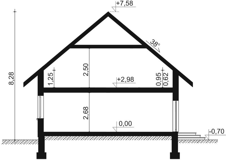 Ściany: bloczki z betonu komórkowego + ocieplenie. Strop parteru: typu „TERIVA”. Strop poddasza: drewniany. Dach: dwuspadowy. Pokrycie dachu: dachówka lub blacha. Ocieplenie poddasza: wełna mineralna. Tynk: mineralny. Okna dachowe: Velux.