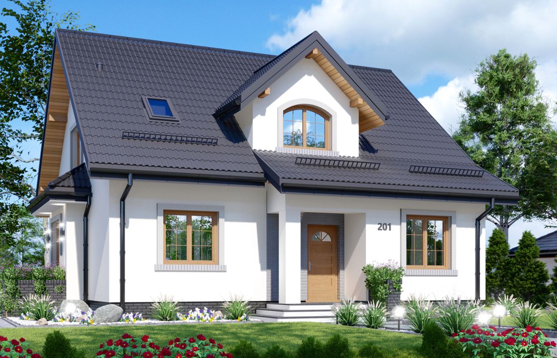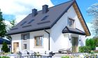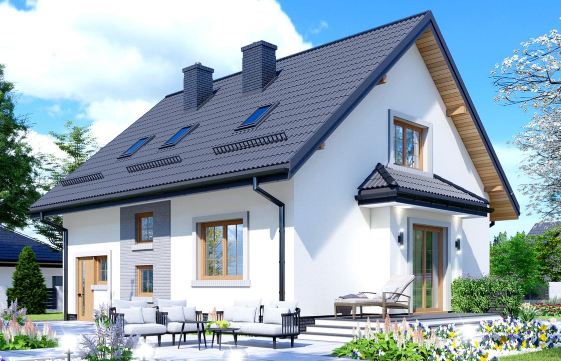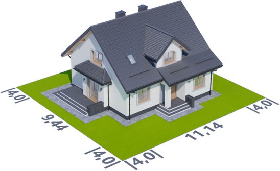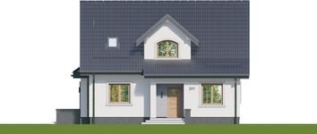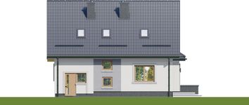 Graficzne opracowanie rzutów poglądowych widocznych na karcie projektu zostało wykonane przez Extradom.pl. Prezentowane przez Extradom.pl wizualizacje wykonane zostały przez autora projektu i należy poczytywać je jedynie za przykład i propozycję wykończenia, wizję architektoniczną autora projektu. Ostateczne wykończenie budynku może nastąpić na wiele sposobów. Szczegółowe rozwiązania zastosowane w oferowanej dokumentacji - w tym również ilość, lokalizacje i wygląd okien, drzwi, kominów - mogą w niewielkim stopniu różnić się od prezentowanej wizualizacji budynku.