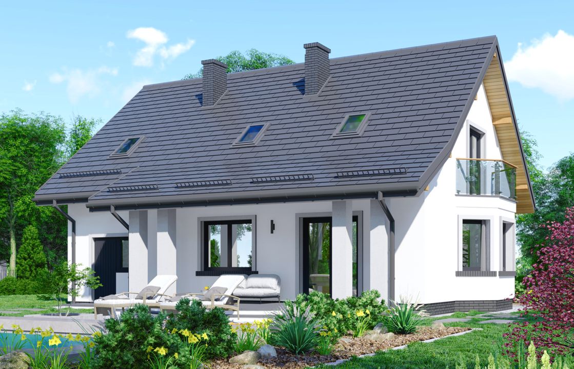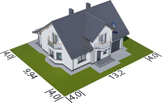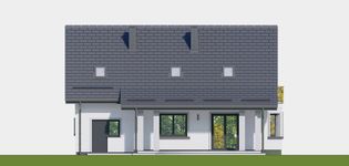 Graficzne opracowanie rzutów poglądowych widocznych na karcie projektu zostało wykonane przez Extradom.pl. Prezentowane przez Extradom.pl wizualizacje wykonane zostały przez autora projektu i należy poczytywać je jedynie za przykład i propozycję wykończenia, wizję architektoniczną autora projektu. Ostateczne wykończenie budynku może nastąpić na wiele sposobów. Szczegółowe rozwiązania zastosowane w oferowanej dokumentacji - w tym również ilość, lokalizacje i wygląd okien, drzwi, kominów - mogą w niewielkim stopniu różnić się od prezentowanej wizualizacji budynku.