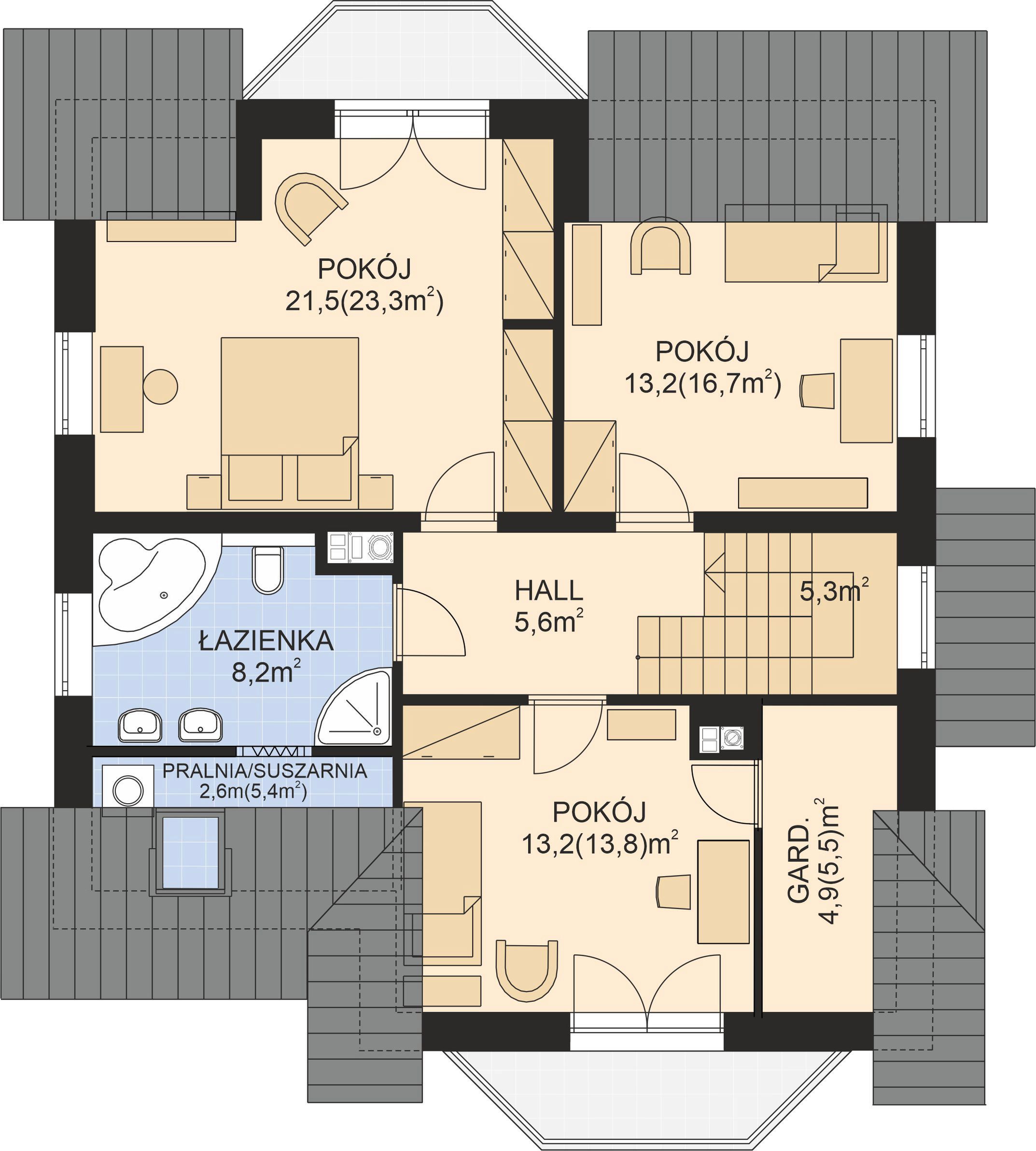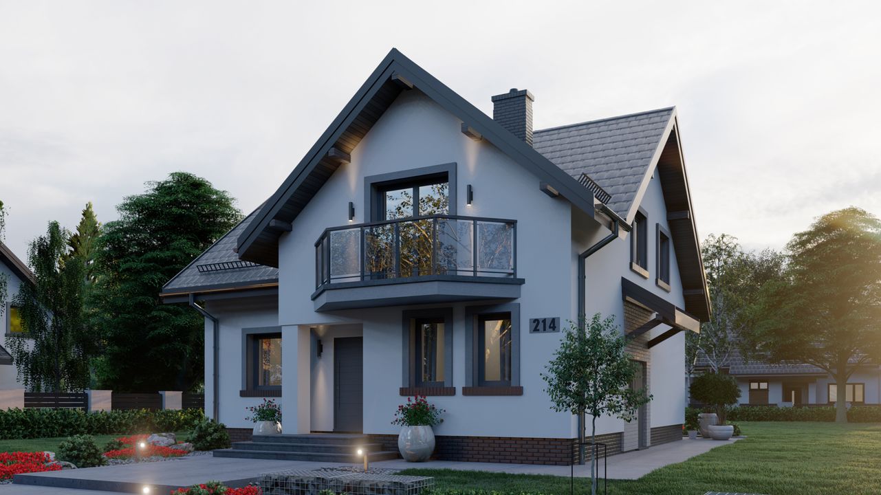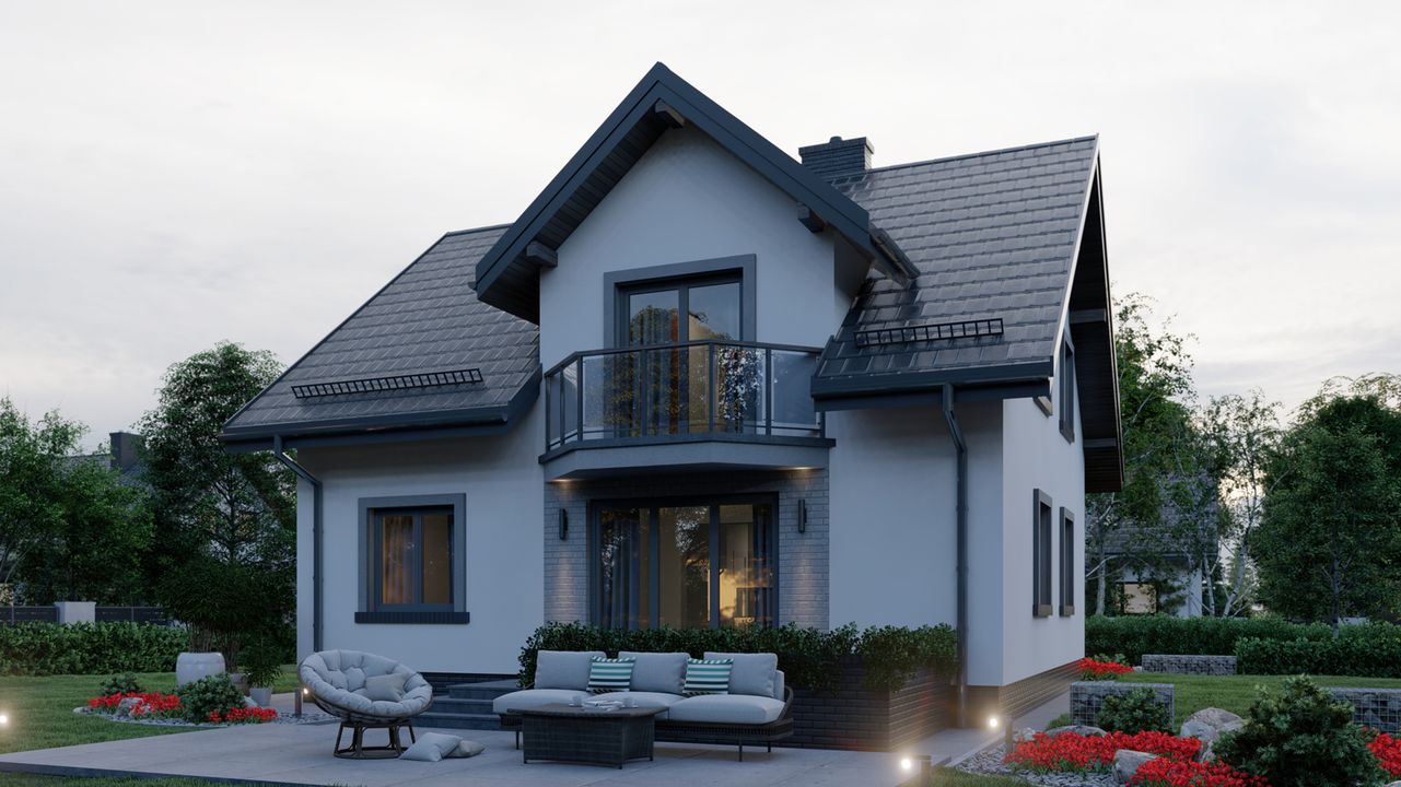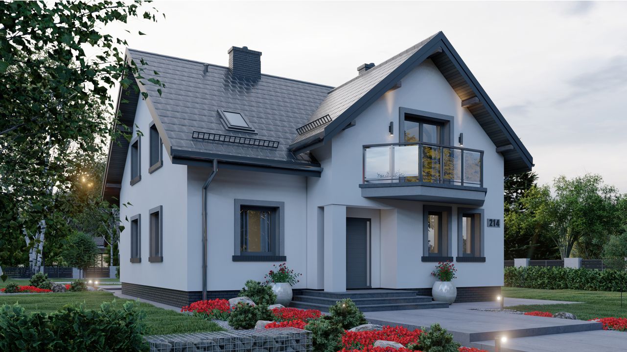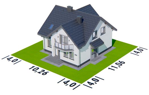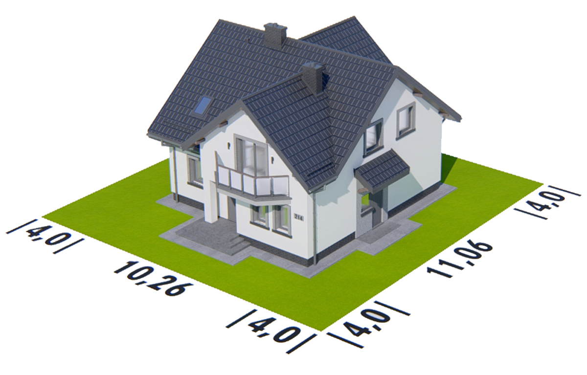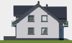 Graficzne opracowanie rzutów poglądowych widocznych na karcie projektu zostało wykonane przez Extradom.pl. Prezentowane przez Extradom.pl wizualizacje wykonane zostały przez autora projektu i należy poczytywać je jedynie za przykład i propozycję wykończenia, wizję architektoniczną autora projektu. Ostateczne wykończenie budynku może nastąpić na wiele sposobów. Szczegółowe rozwiązania zastosowane w oferowanej dokumentacji - w tym również ilość, lokalizacje i wygląd okien, drzwi, kominów - mogą w niewielkim stopniu różnić się od prezentowanej wizualizacji budynku.