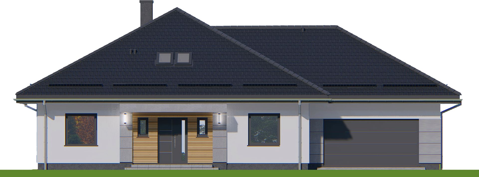 To parterowy dom w tradycyjnym stylu z dwustanowiskowym garażem wpisanym w bryłę budynku, stworzony dla 3-4 osobowej rodziny. Jego przemyślany układ funkcjonalny na jednym poziomie zapewnia komfort i wygodę codziennego życia, łącząc otwartą przestrzeń dzienną z kameralną strefą prywatną.