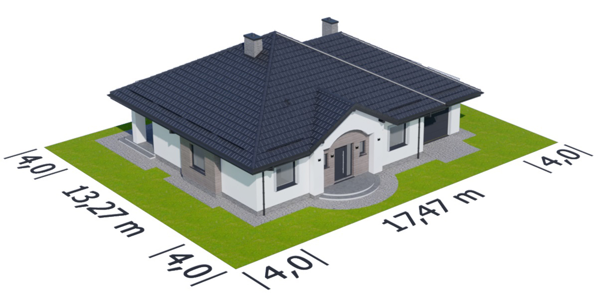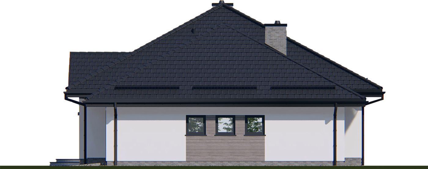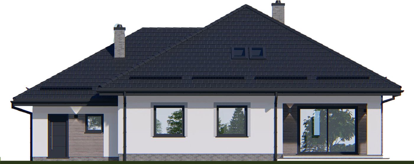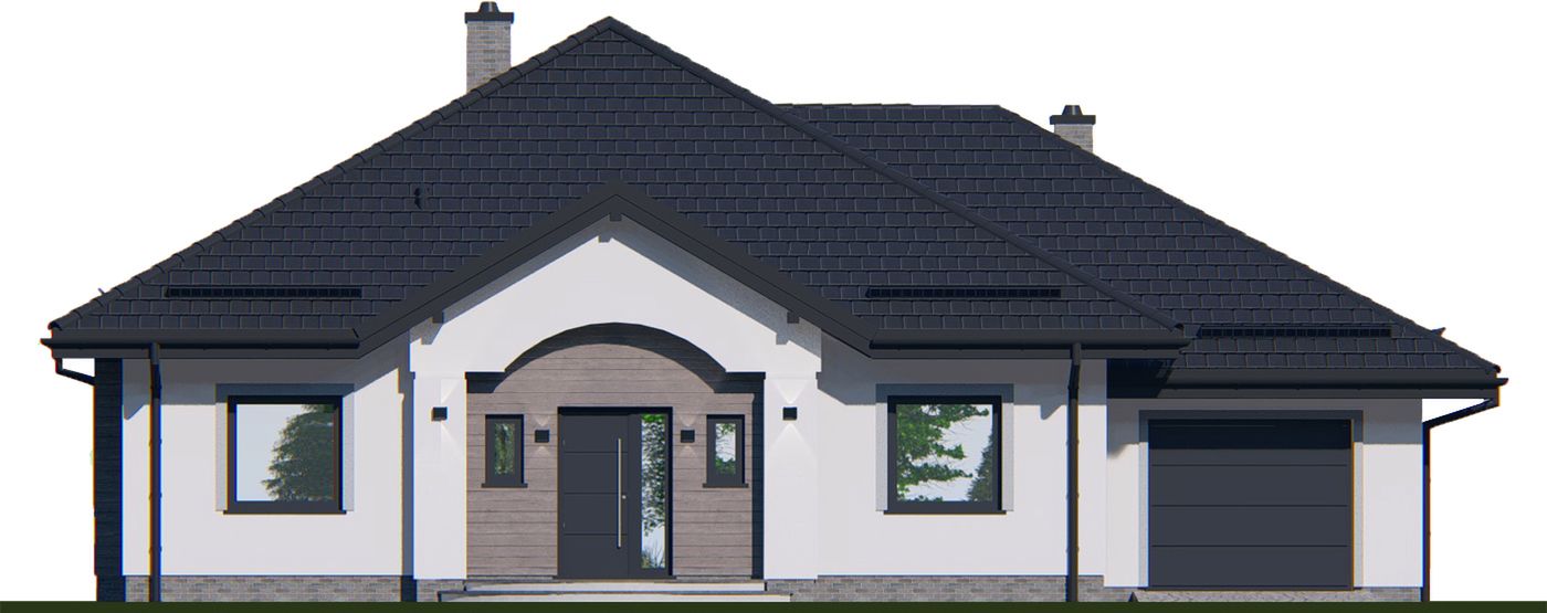 Graficzne opracowanie rzutów poglądowych widocznych na karcie projektu zostało wykonane przez Extradom.pl. Prezentowane przez Extradom.pl wizualizacje wykonane zostały przez autora projektu i należy poczytywać je jedynie za przykład i propozycję wykończenia, wizję architektoniczną autora projektu. Ostateczne wykończenie budynku może nastąpić na wiele sposobów. Szczegółowe rozwiązania zastosowane w oferowanej dokumentacji - w tym również ilość, lokalizacje i wygląd okien, drzwi, kominów - mogą w niewielkim stopniu różnić się od prezentowanej wizualizacji budynku.