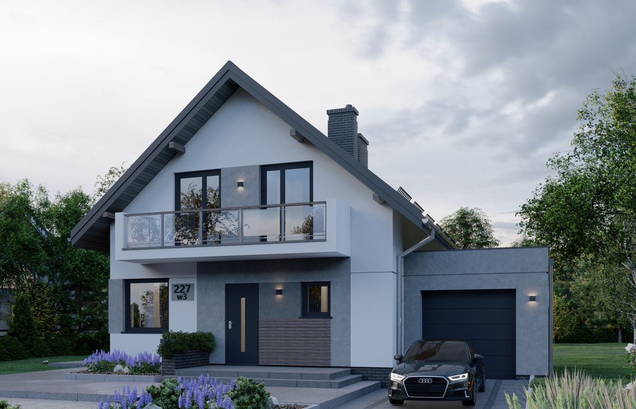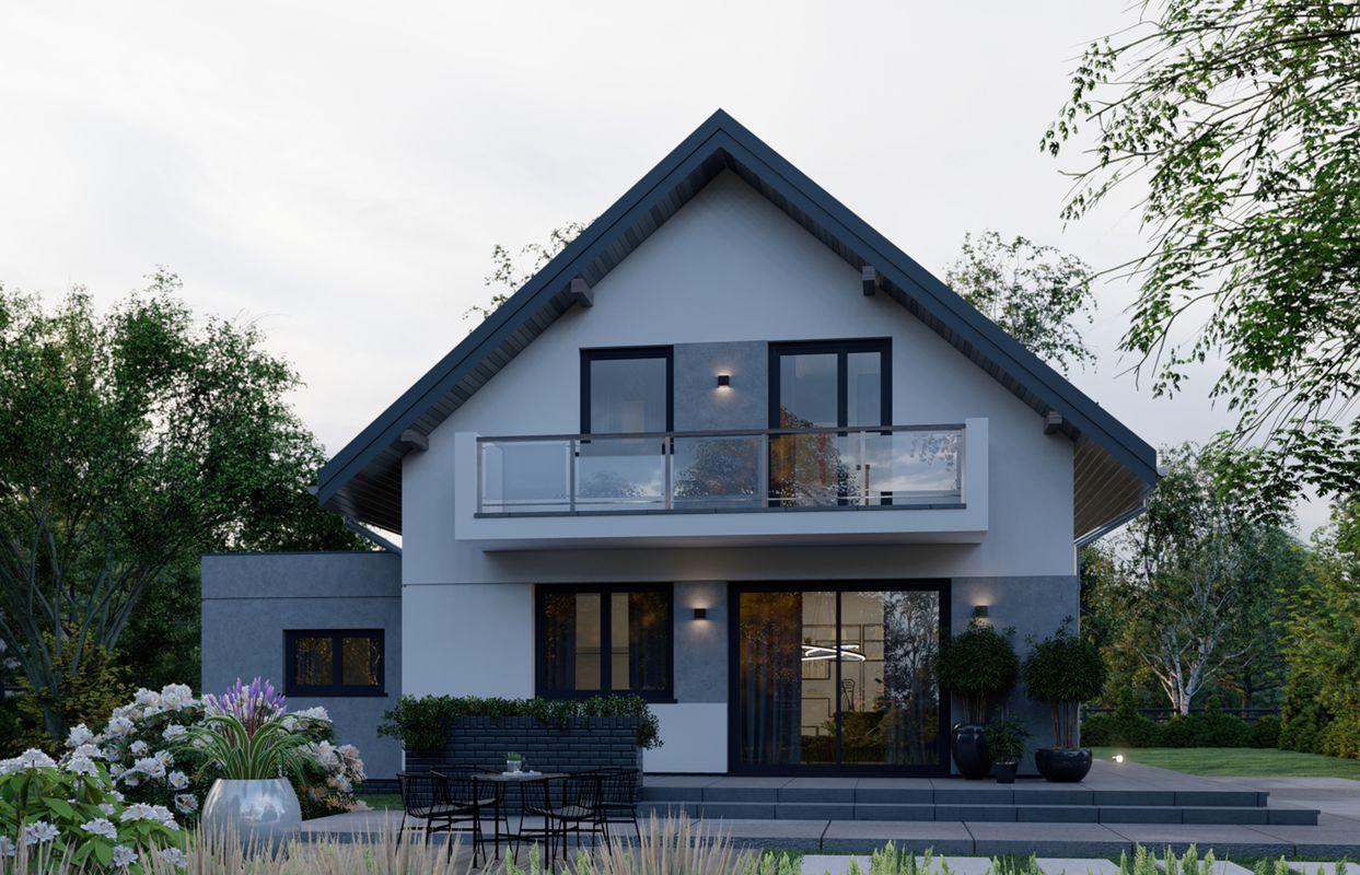 Graficzne opracowanie rzutów poglądowych widocznych na karcie projektu zostało wykonane przez Extradom.pl. Prezentowane przez Extradom.pl wizualizacje wykonane zostały przez autora projektu i należy poczytywać je jedynie za przykład i propozycję wykończenia, wizję architektoniczną autora projektu. Ostateczne wykończenie budynku może nastąpić na wiele sposobów. Szczegółowe rozwiązania zastosowane w oferowanej dokumentacji - w tym również ilość, lokalizacje i wygląd okien, drzwi, kominów - mogą w niewielkim stopniu różnić się od prezentowanej wizualizacji budynku.