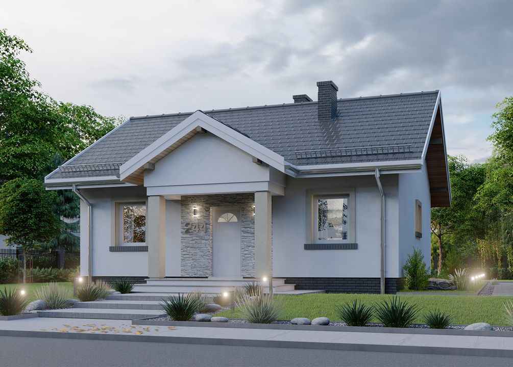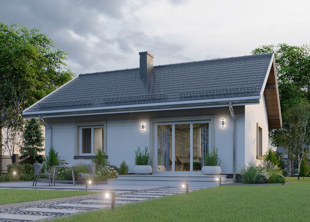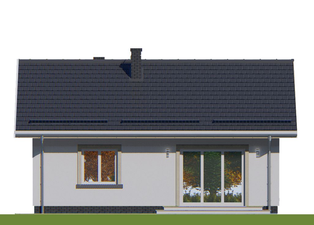 Graficzne opracowanie rzutów poglądowych widocznych na karcie projektu zostało wykonane przez Extradom.pl. Prezentowane przez Extradom.pl wizualizacje wykonane zostały przez autora projektu i należy poczytywać je jedynie za przykład i propozycję wykończenia, wizję architektoniczną autora projektu. Ostateczne wykończenie budynku może nastąpić na wiele sposobów. Szczegółowe rozwiązania zastosowane w oferowanej dokumentacji - w tym również ilość, lokalizacje i wygląd okien, drzwi, kominów - mogą w niewielkim stopniu różnić się od prezentowanej wizualizacji budynku.