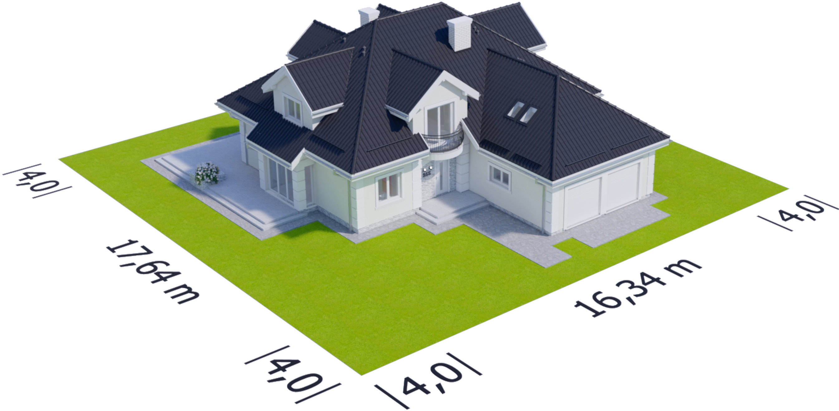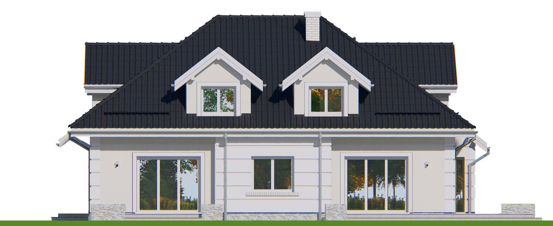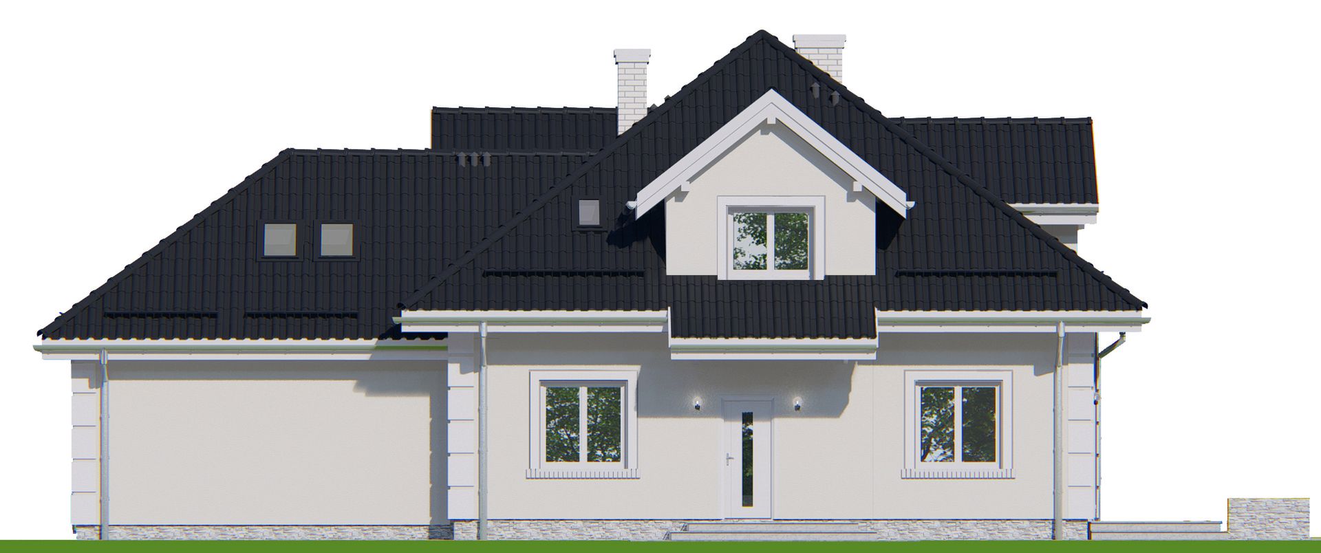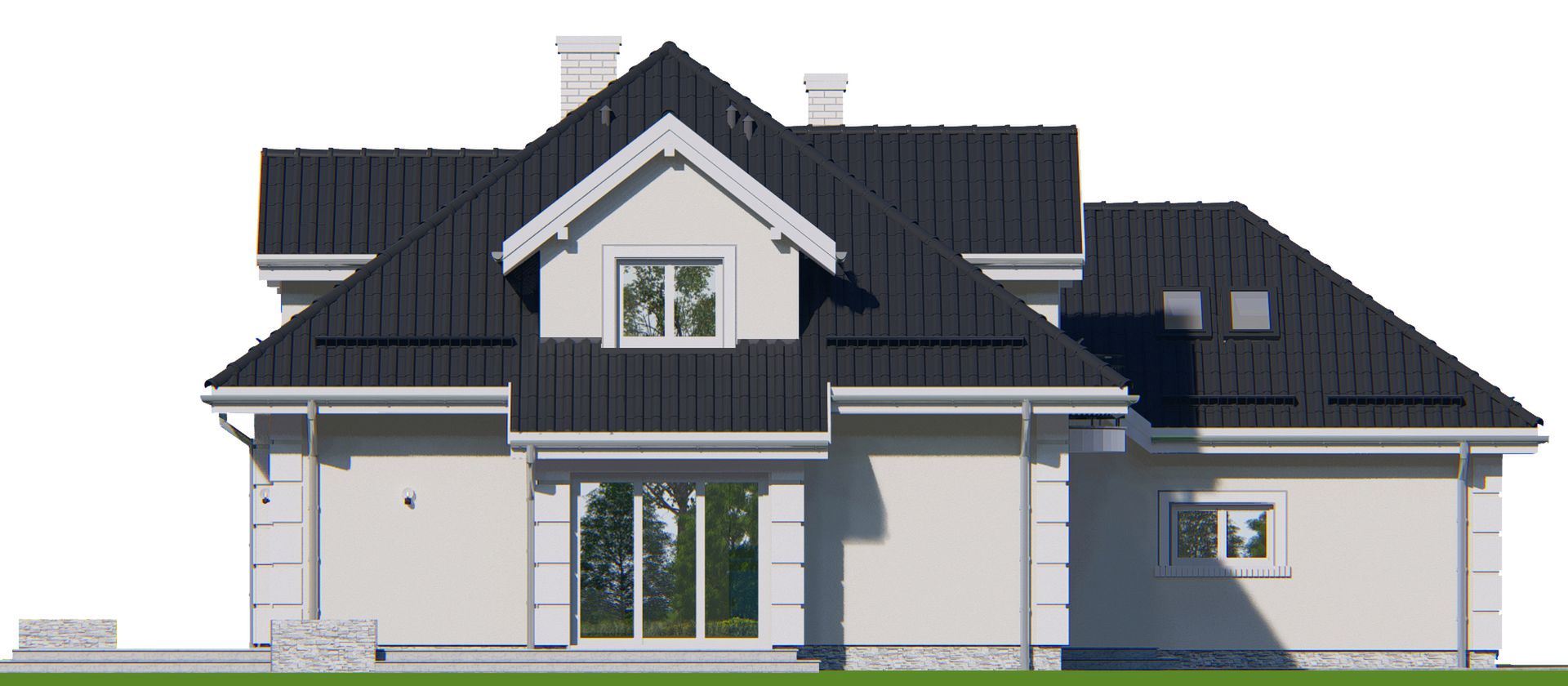 Graficzne opracowanie rzutów poglądowych widocznych na karcie projektu zostało wykonane przez Extradom.pl. Prezentowane przez Extradom.pl wizualizacje wykonane zostały przez autora projektu i należy poczytywać je jedynie za przykład i propozycję wykończenia, wizję architektoniczną autora projektu. Ostateczne wykończenie budynku może nastąpić na wiele sposobów. Szczegółowe rozwiązania zastosowane w oferowanej dokumentacji - w tym również ilość, lokalizacje i wygląd okien, drzwi, kominów - mogą w niewielkim stopniu różnić się od prezentowanej wizualizacji budynku.