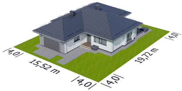 Graficzne opracowanie rzutów poglądowych widocznych na karcie projektu zostało wykonane przez Extradom.pl. Prezentowane przez Extradom.pl wizualizacje wykonane zostały przez autora projektu i należy poczytywać je jedynie za przykład i propozycję wykończenia, wizję architektoniczną autora projektu. Ostateczne wykończenie budynku może nastąpić na wiele sposobów. Szczegółowe rozwiązania zastosowane w oferowanej dokumentacji - w tym również ilość, lokalizacje i wygląd okien, drzwi, kominów - mogą w niewielkim stopniu różnić się od prezentowanej wizualizacji budynku.