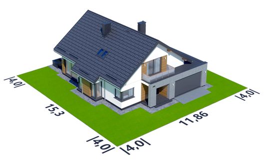 Graficzne opracowanie rzutów poglądowych widocznych na karcie projektu zostało wykonane przez Extradom.pl. Prezentowane przez Extradom.pl wizualizacje wykonane zostały przez autora projektu i należy poczytywać je jedynie za przykład i propozycję wykończenia, wizję architektoniczną autora projektu. Ostateczne wykończenie budynku może nastąpić na wiele sposobów. Szczegółowe rozwiązania zastosowane w oferowanej dokumentacji - w tym również ilość, lokalizacje i wygląd okien, drzwi, kominów - mogą w niewielkim stopniu różnić się od prezentowanej wizualizacji budynku.