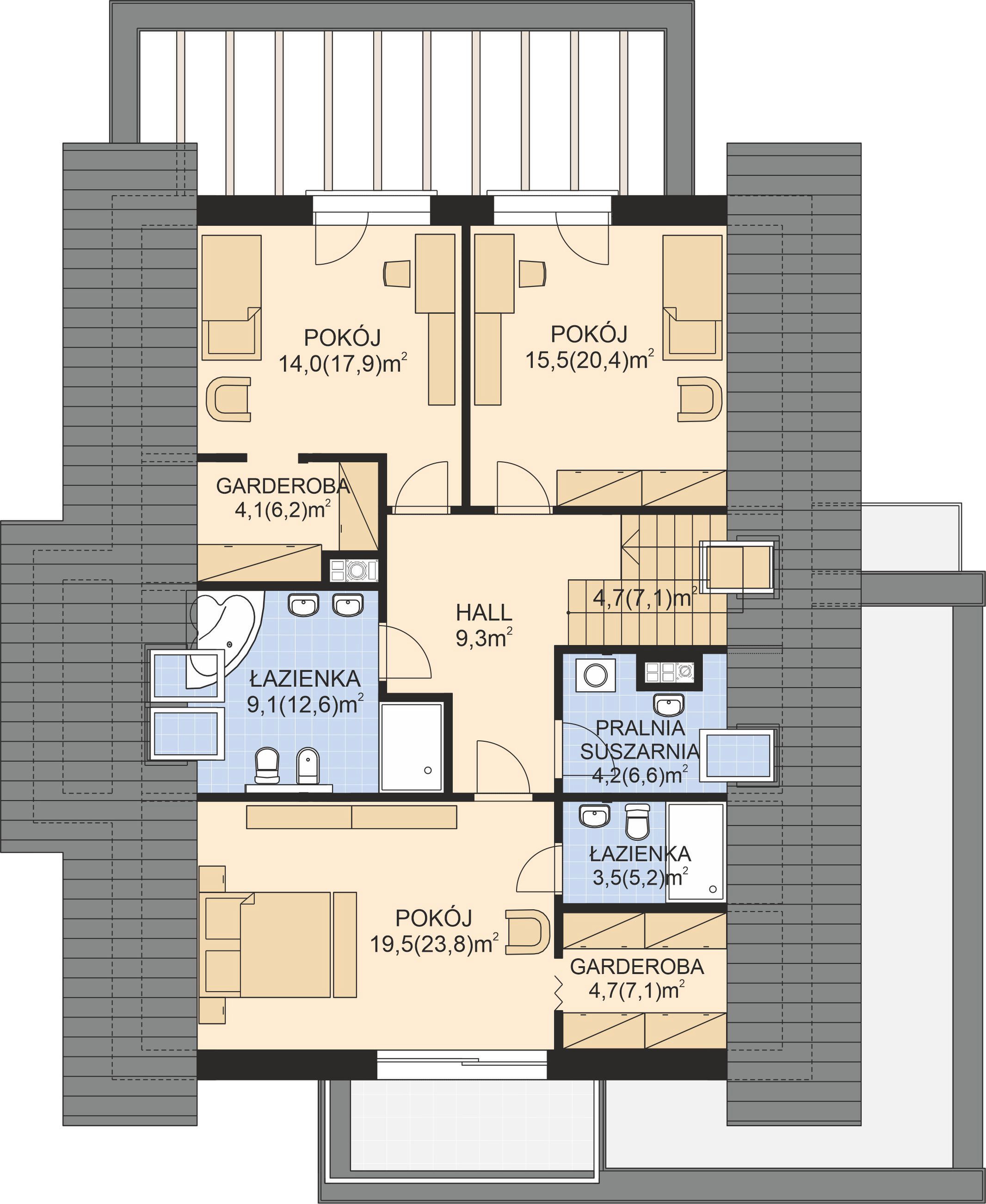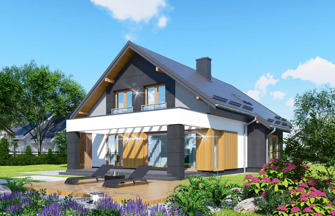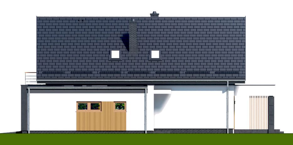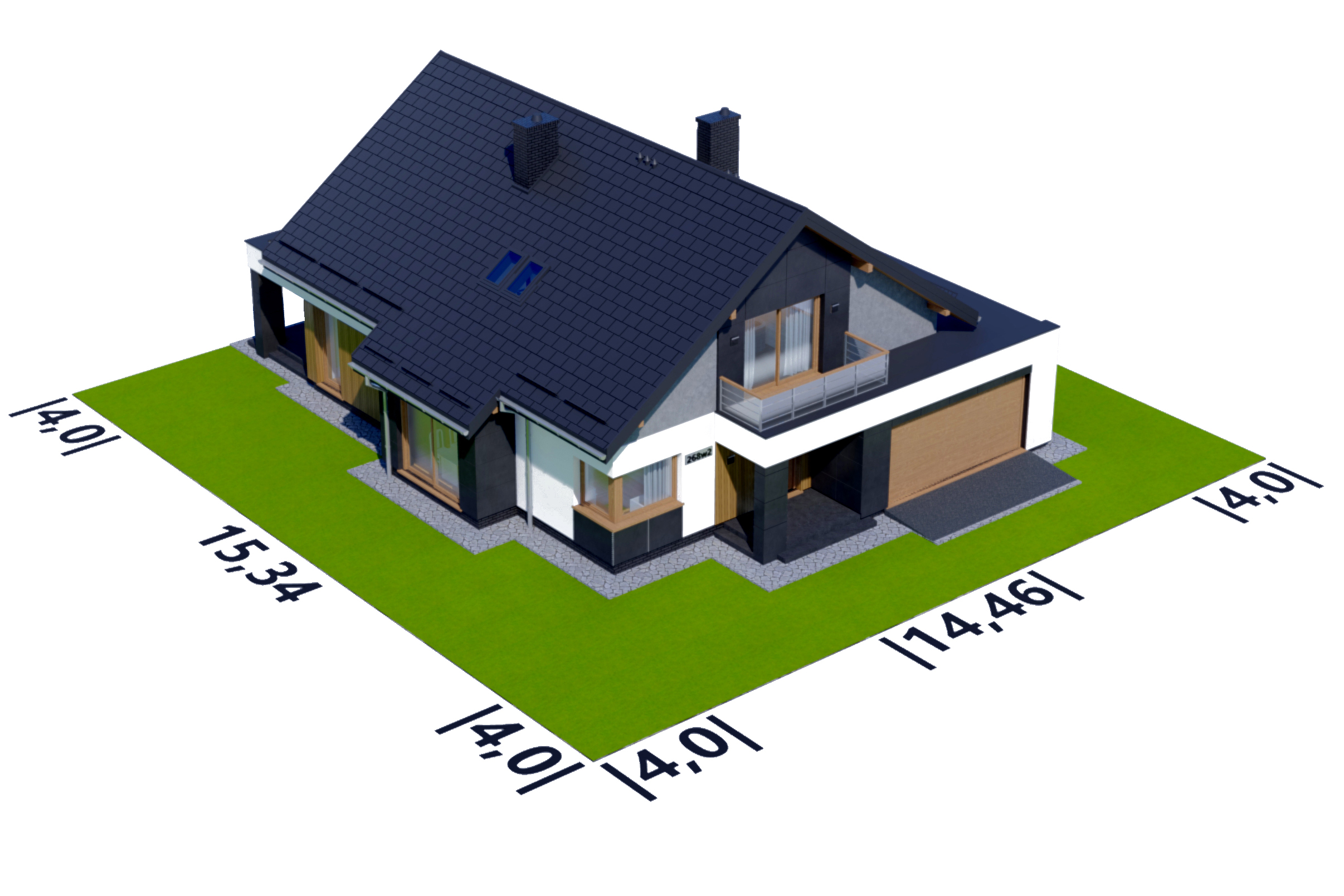 Graficzne opracowanie rzutów poglądowych widocznych na karcie projektu zostało wykonane przez Extradom.pl. Prezentowane przez Extradom.pl wizualizacje wykonane zostały przez autora projektu i należy poczytywać je jedynie za przykład i propozycję wykończenia, wizję architektoniczną autora projektu. Ostateczne wykończenie budynku może nastąpić na wiele sposobów. Szczegółowe rozwiązania zastosowane w oferowanej dokumentacji - w tym również ilość, lokalizacje i wygląd okien, drzwi, kominów - mogą w niewielkim stopniu różnić się od prezentowanej wizualizacji budynku.