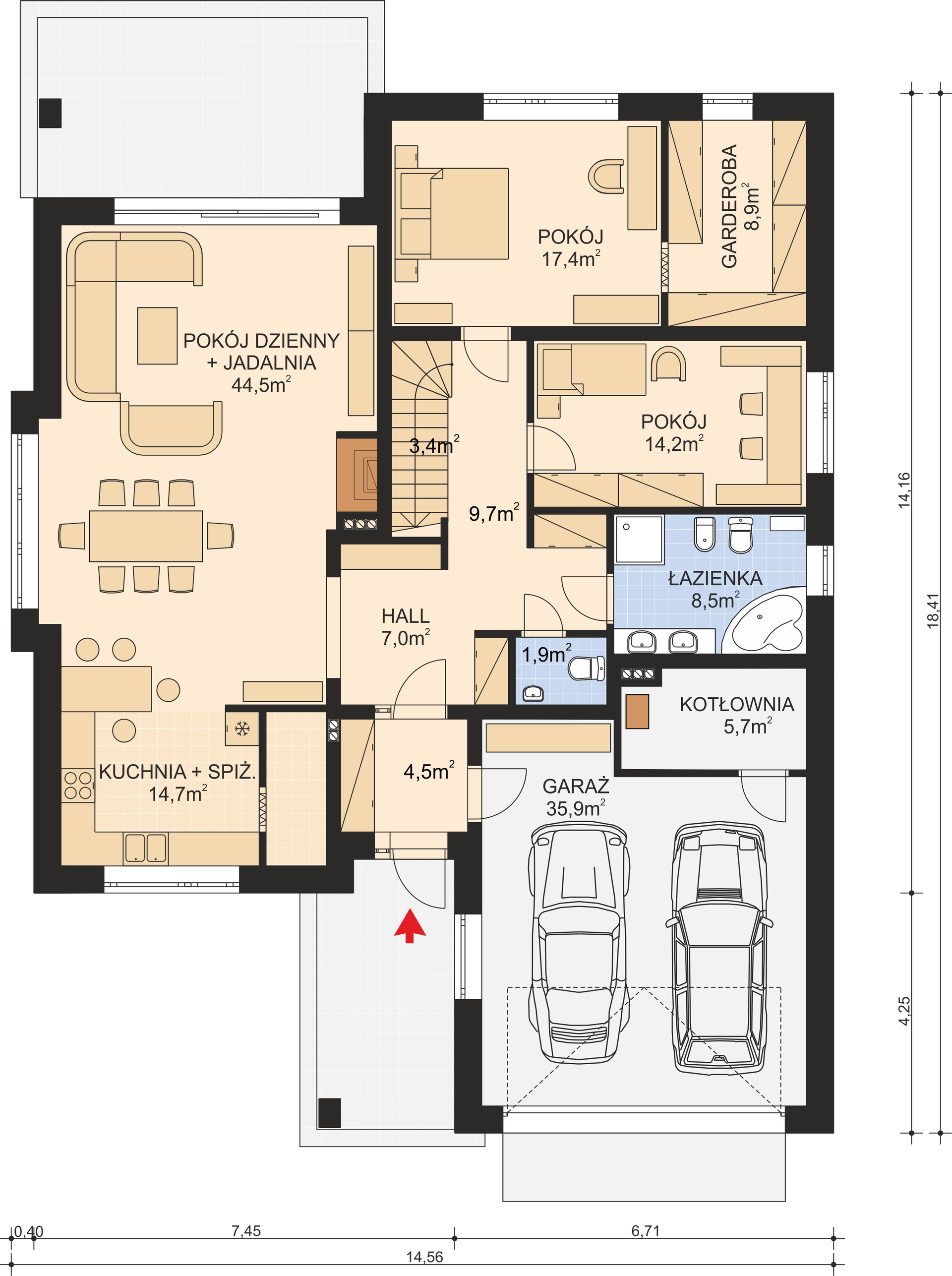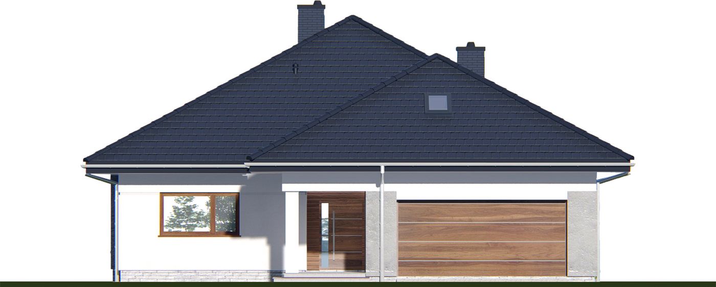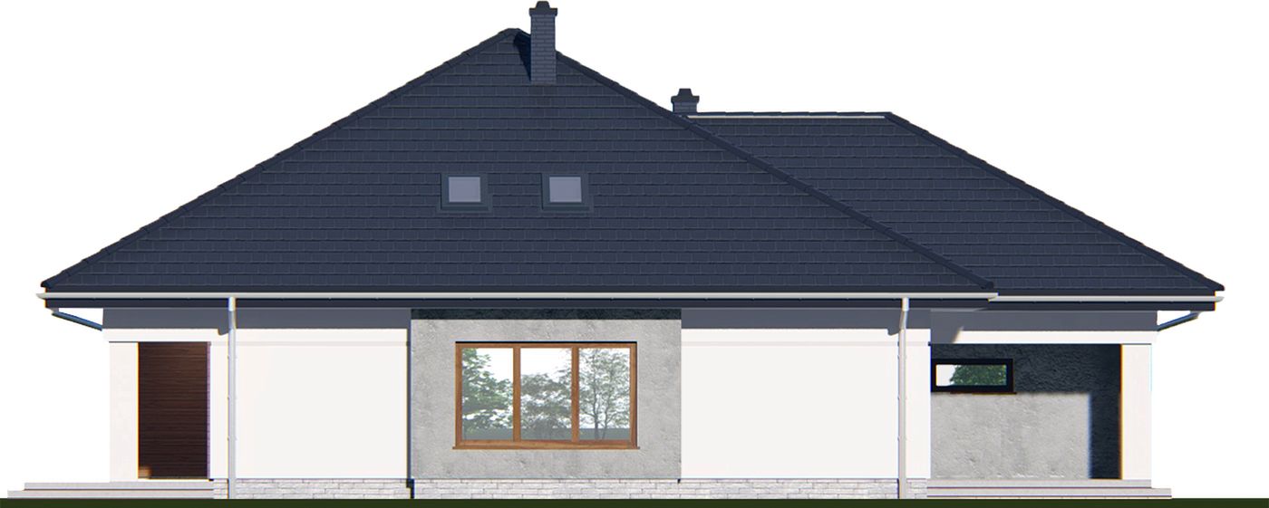 Graficzne opracowanie rzutów poglądowych widocznych na karcie projektu zostało wykonane przez Extradom.pl. Prezentowane przez Extradom.pl wizualizacje wykonane zostały przez autora projektu i należy poczytywać je jedynie za przykład i propozycję wykończenia, wizję architektoniczną autora projektu. Ostateczne wykończenie budynku może nastąpić na wiele sposobów. Szczegółowe rozwiązania zastosowane w oferowanej dokumentacji - w tym również ilość, lokalizacje i wygląd okien, drzwi, kominów - mogą w niewielkim stopniu różnić się od prezentowanej wizualizacji budynku.