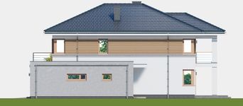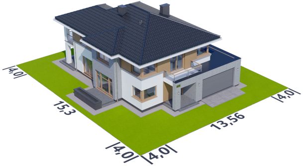 Graficzne opracowanie rzutów poglądowych widocznych na karcie projektu zostało wykonane przez Extradom.pl. Prezentowane przez Extradom.pl wizualizacje wykonane zostały przez autora projektu i należy poczytywać je jedynie za przykład i propozycję wykończenia, wizję architektoniczną autora projektu. Ostateczne wykończenie budynku może nastąpić na wiele sposobów. Szczegółowe rozwiązania zastosowane w oferowanej dokumentacji - w tym również ilość, lokalizacje i wygląd okien, drzwi, kominów - mogą w niewielkim stopniu różnić się od prezentowanej wizualizacji budynku.