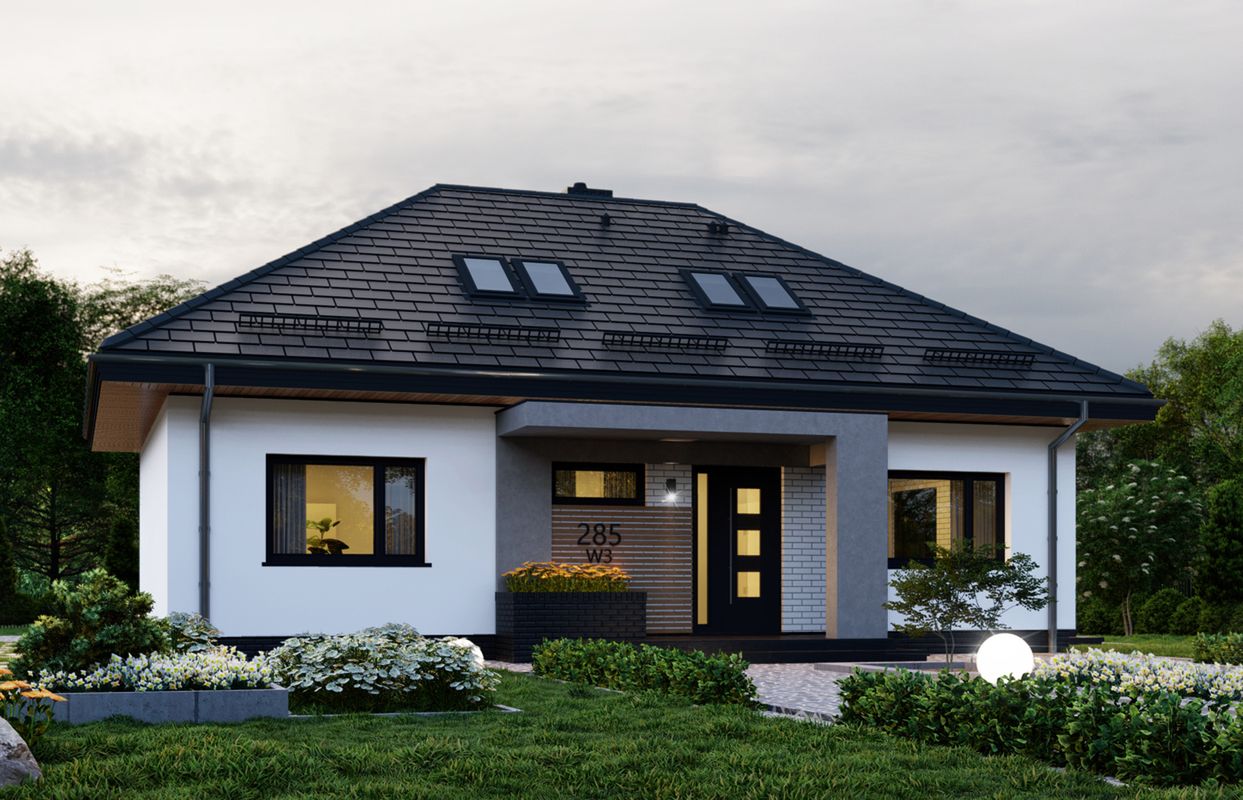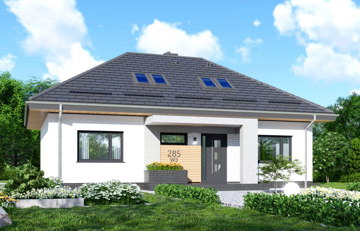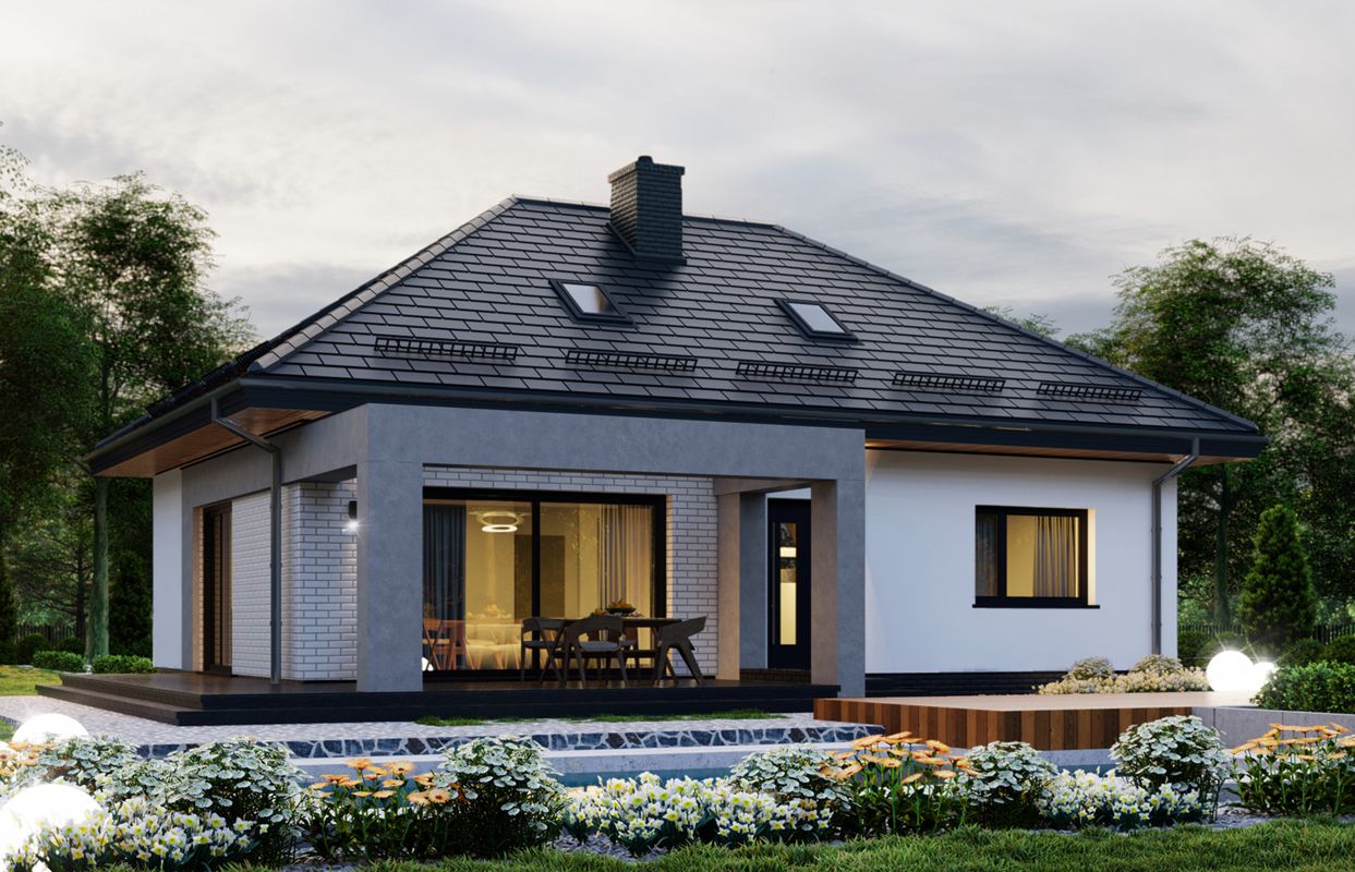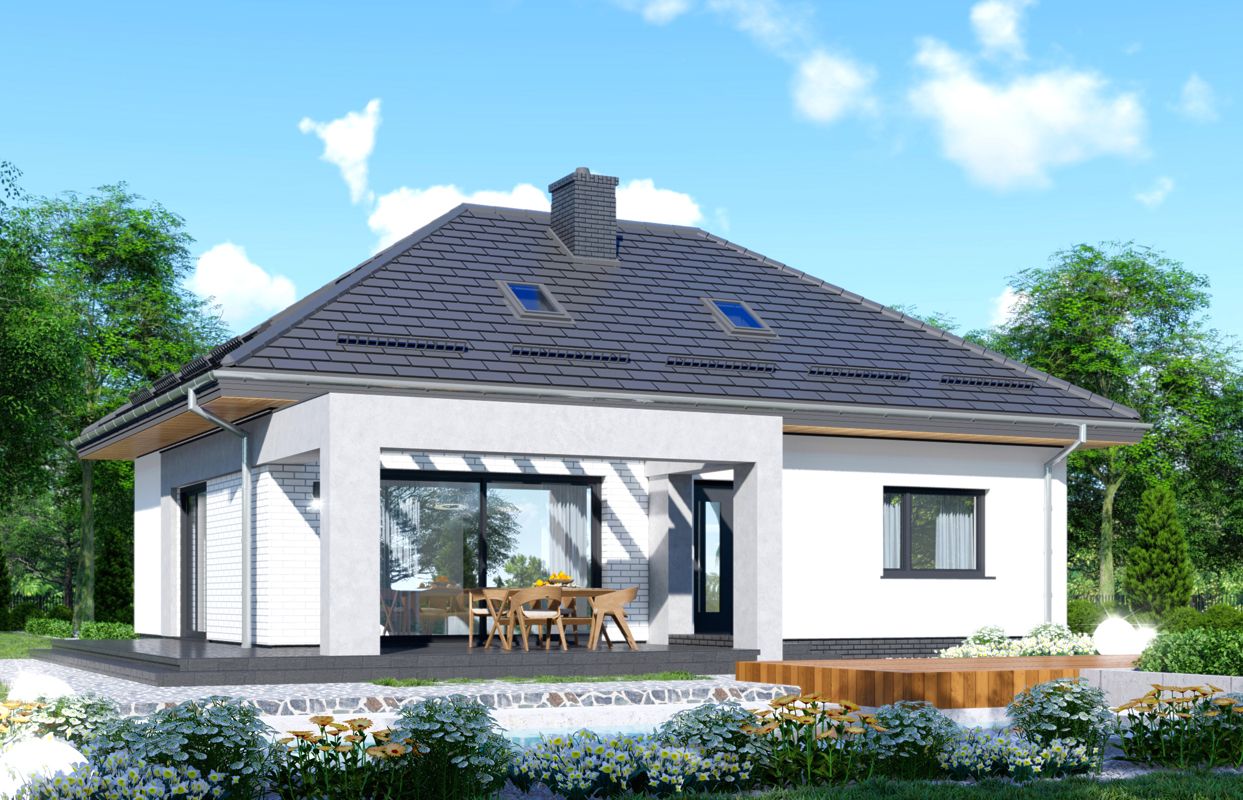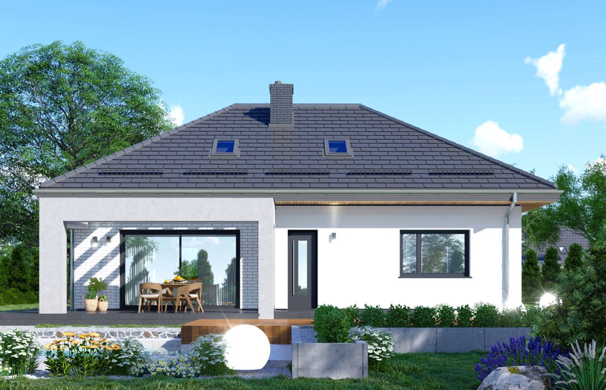 Graficzne opracowanie rzutów poglądowych widocznych na karcie projektu zostało wykonane przez Extradom.pl. Prezentowane przez Extradom.pl wizualizacje wykonane zostały przez autora projektu i należy poczytywać je jedynie za przykład i propozycję wykończenia, wizję architektoniczną autora projektu. Ostateczne wykończenie budynku może nastąpić na wiele sposobów. Szczegółowe rozwiązania zastosowane w oferowanej dokumentacji - w tym również ilość, lokalizacje i wygląd okien, drzwi, kominów - mogą w niewielkim stopniu różnić się od prezentowanej wizualizacji budynku.
