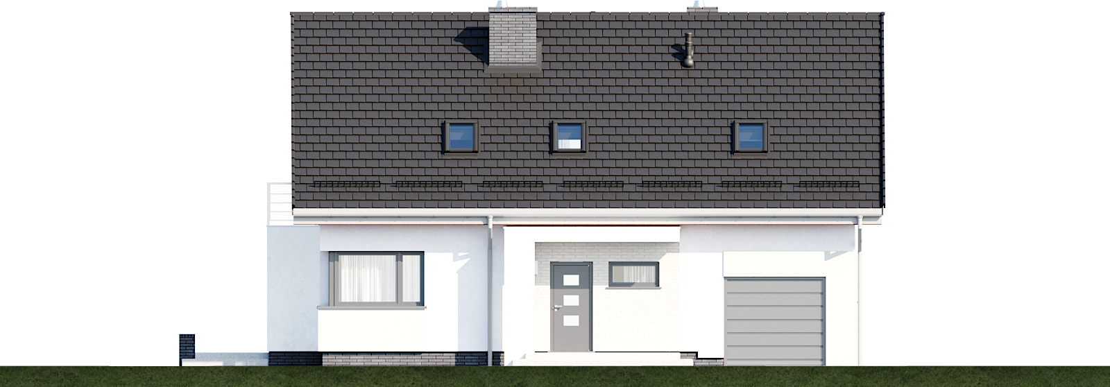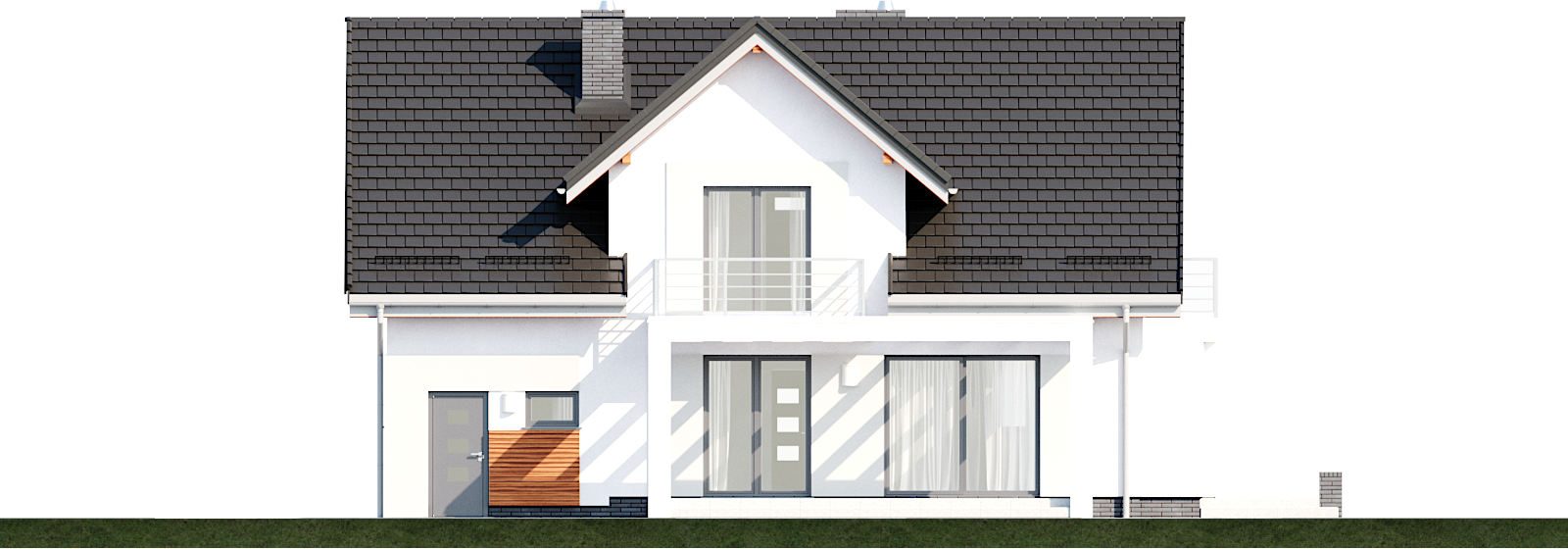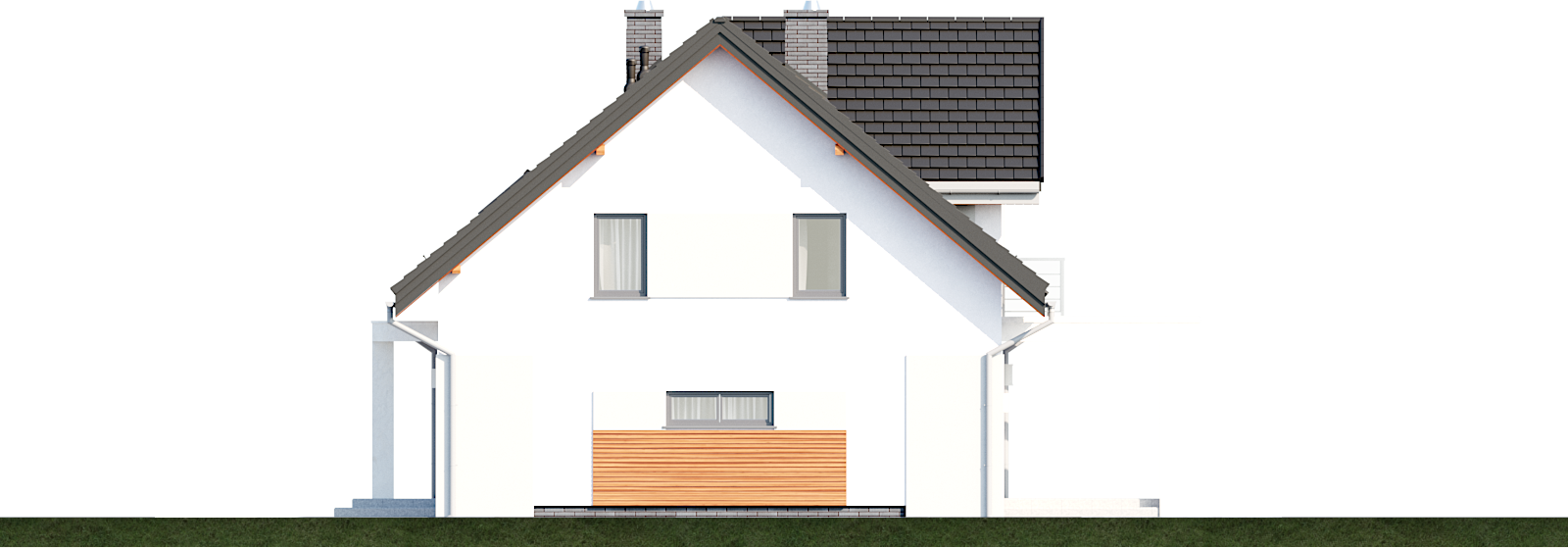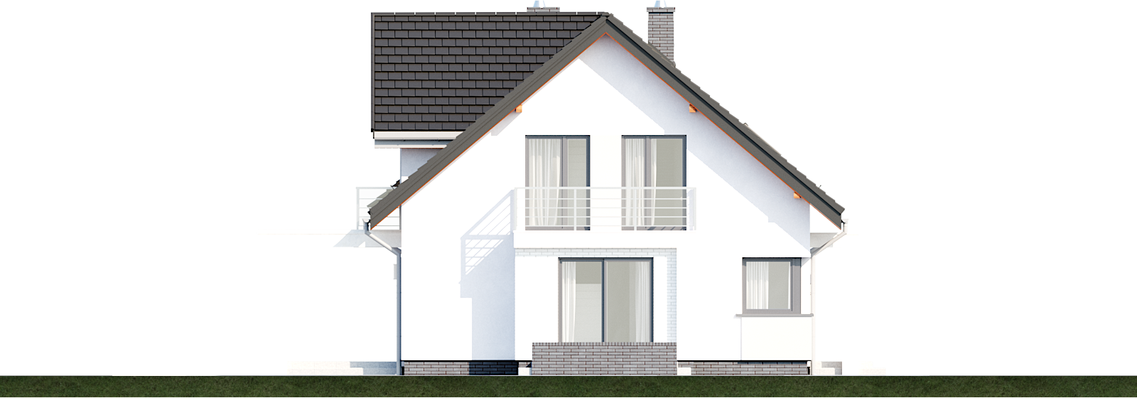 Graficzne opracowanie rzutów poglądowych widocznych na karcie projektu zostało wykonane przez Extradom.pl. Prezentowane przez Extradom.pl wizualizacje wykonane zostały przez autora projektu i należy poczytywać je jedynie za przykład i propozycję wykończenia, wizję architektoniczną autora projektu. Ostateczne wykończenie budynku może nastąpić na wiele sposobów. Szczegółowe rozwiązania zastosowane w oferowanej dokumentacji - w tym również ilość, lokalizacje i wygląd okien, drzwi, kominów - mogą w niewielkim stopniu różnić się od prezentowanej wizualizacji budynku.