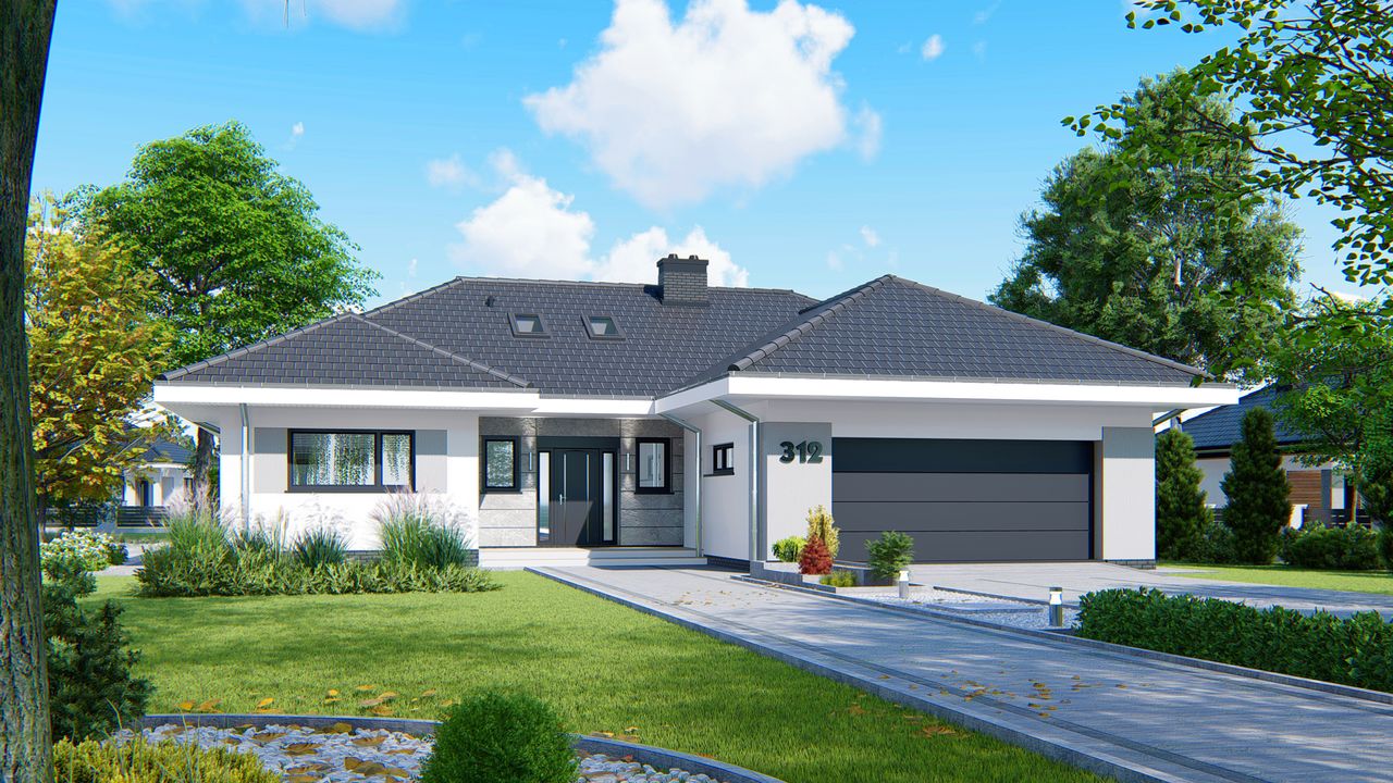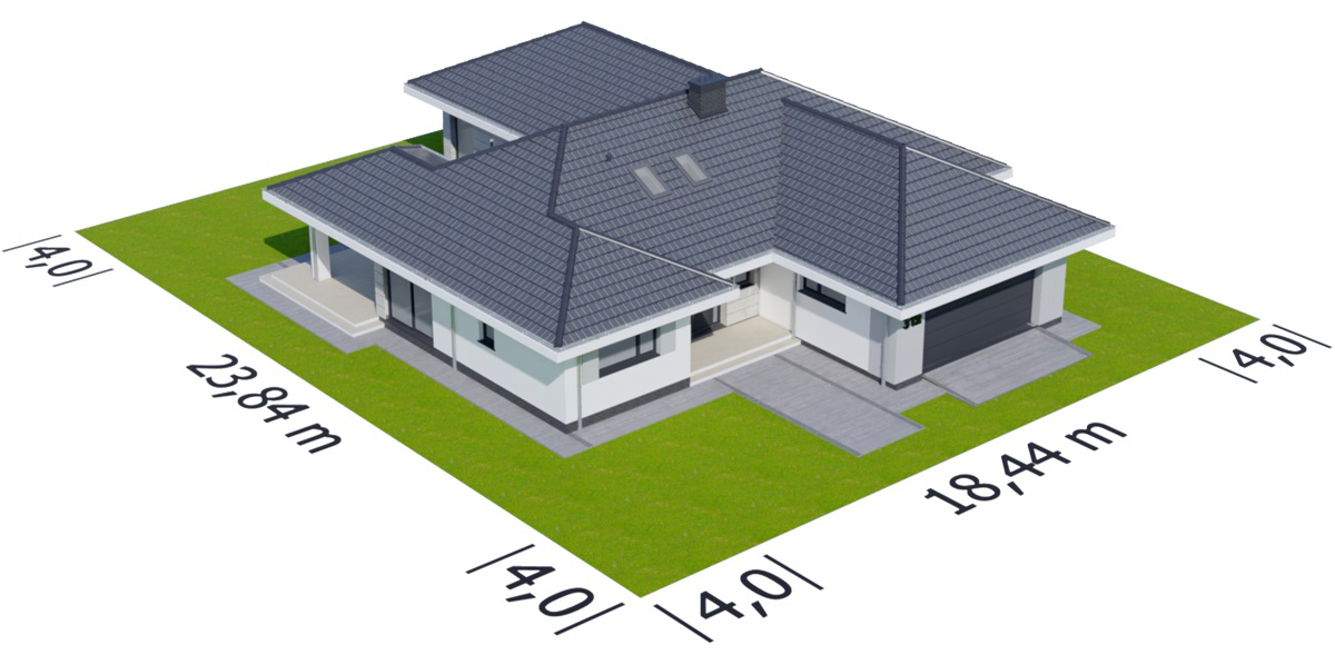 Graficzne opracowanie rzutów poglądowych widocznych na karcie projektu zostało wykonane przez Extradom.pl. Prezentowane przez Extradom.pl wizualizacje wykonane zostały przez autora projektu i należy poczytywać je jedynie za przykład i propozycję wykończenia, wizję architektoniczną autora projektu. Ostateczne wykończenie budynku może nastąpić na wiele sposobów. Szczegółowe rozwiązania zastosowane w oferowanej dokumentacji - w tym również ilość, lokalizacje i wygląd okien, drzwi, kominów - mogą w niewielkim stopniu różnić się od prezentowanej wizualizacji budynku.