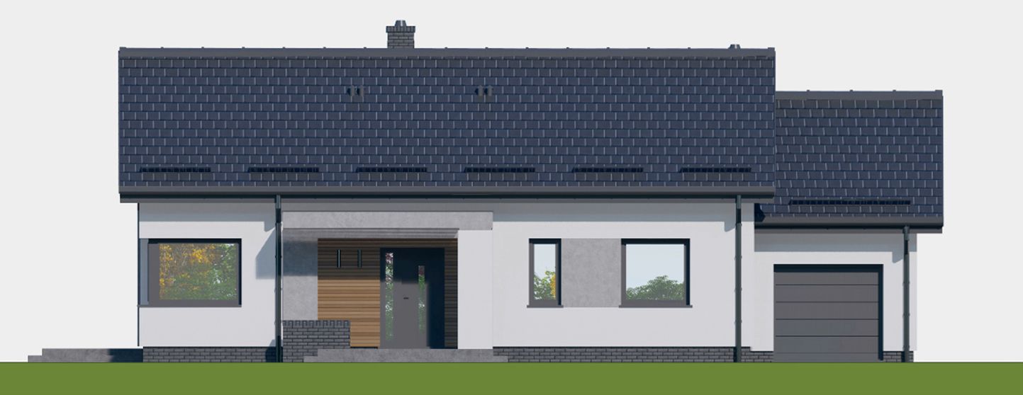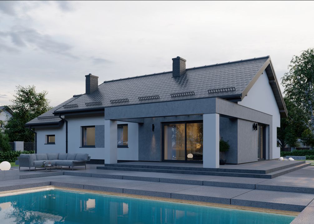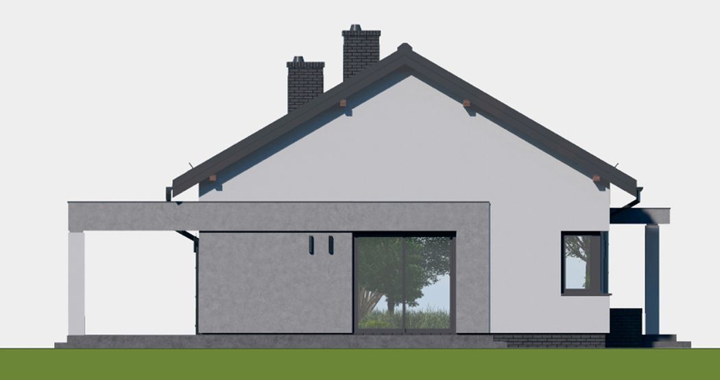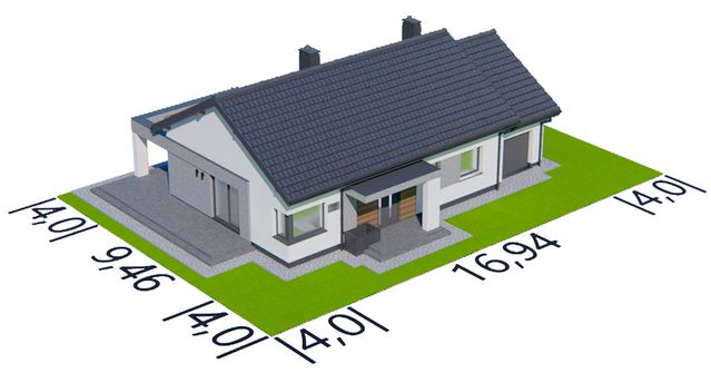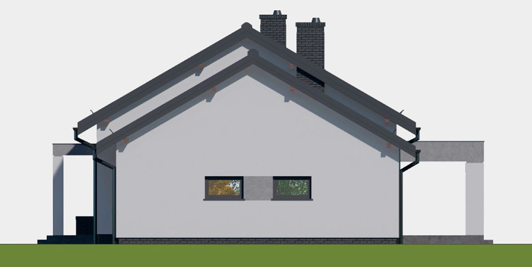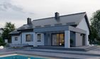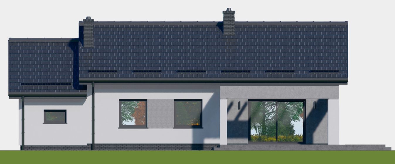 Graficzne opracowanie rzutów poglądowych widocznych na karcie projektu zostało wykonane przez Extradom.pl. Prezentowane przez Extradom.pl wizualizacje wykonane zostały przez autora projektu i należy poczytywać je jedynie za przykład i propozycję wykończenia, wizję architektoniczną autora projektu. Ostateczne wykończenie budynku może nastąpić na wiele sposobów. Szczegółowe rozwiązania zastosowane w oferowanej dokumentacji - w tym również ilość, lokalizacje i wygląd okien, drzwi, kominów - mogą w niewielkim stopniu różnić się od prezentowanej wizualizacji budynku.