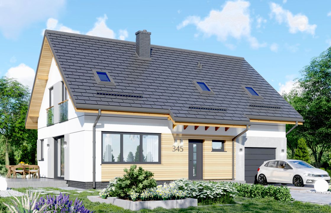 Ściany: bloczki z betonu komórkowego + ocieplenie. Strop parteru: Teriva. Strop poddasza: drewniany. Dach: dwuspadowy. Pokrycie dachu: dachówka lub blacha. Ocieplenie poddasza: wełna mineralna. Tynk: mineralny. Okna dachowe: Velux.