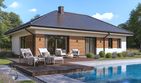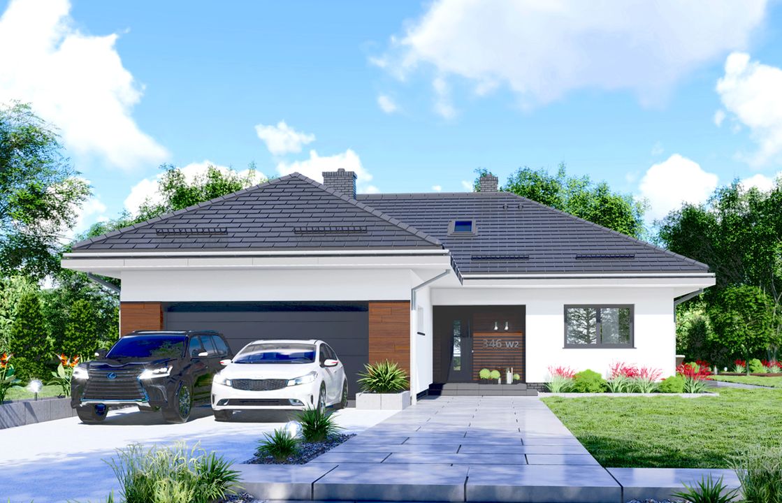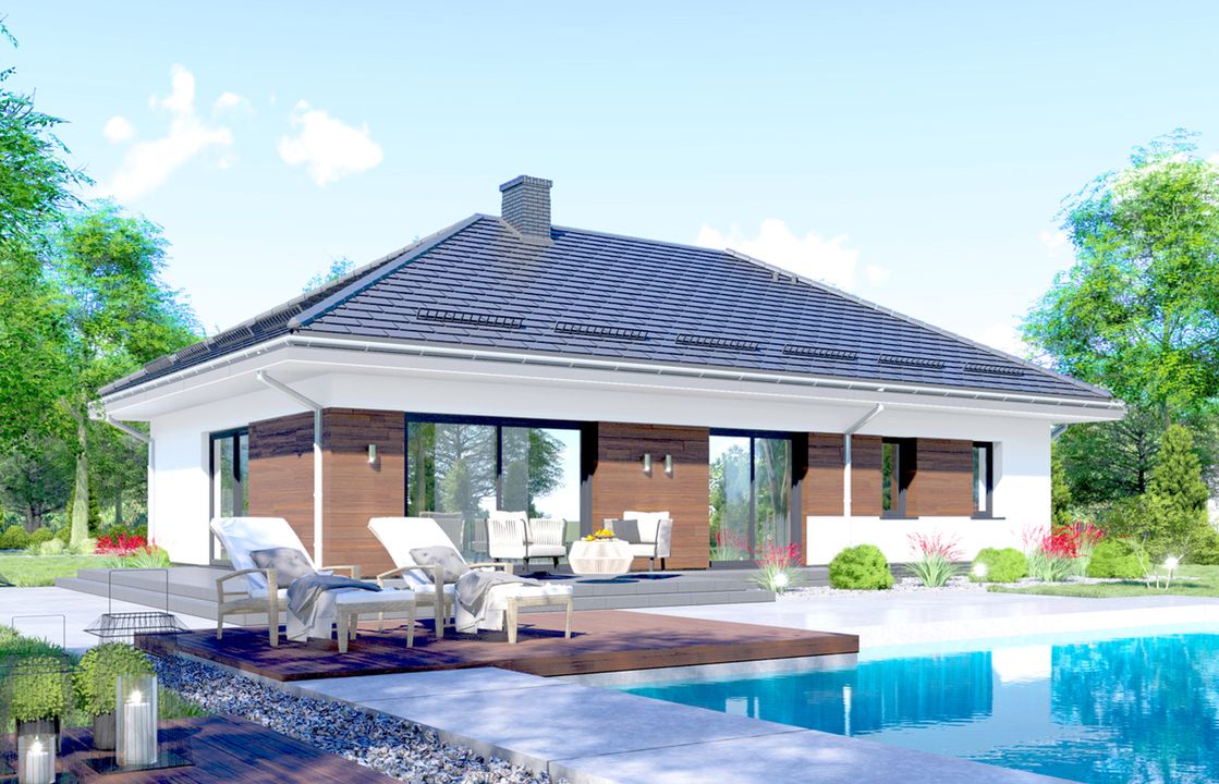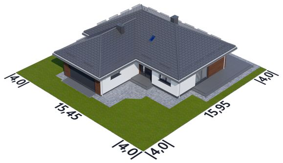 Graficzne opracowanie rzutów poglądowych widocznych na karcie projektu zostało wykonane przez Extradom.pl. Prezentowane przez Extradom.pl wizualizacje wykonane zostały przez autora projektu i należy poczytywać je jedynie za przykład i propozycję wykończenia, wizję architektoniczną autora projektu. Ostateczne wykończenie budynku może nastąpić na wiele sposobów. Szczegółowe rozwiązania zastosowane w oferowanej dokumentacji - w tym również ilość, lokalizacje i wygląd okien, drzwi, kominów - mogą w niewielkim stopniu różnić się od prezentowanej wizualizacji budynku.