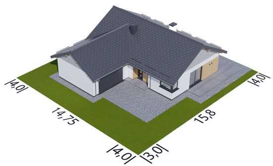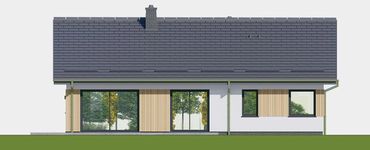 Graficzne opracowanie rzutów poglądowych widocznych na karcie projektu zostało wykonane przez Extradom.pl. Prezentowane przez Extradom.pl wizualizacje wykonane zostały przez autora projektu i należy poczytywać je jedynie za przykład i propozycję wykończenia, wizję architektoniczną autora projektu. Ostateczne wykończenie budynku może nastąpić na wiele sposobów. Szczegółowe rozwiązania zastosowane w oferowanej dokumentacji - w tym również ilość, lokalizacje i wygląd okien, drzwi, kominów - mogą w niewielkim stopniu różnić się od prezentowanej wizualizacji budynku.