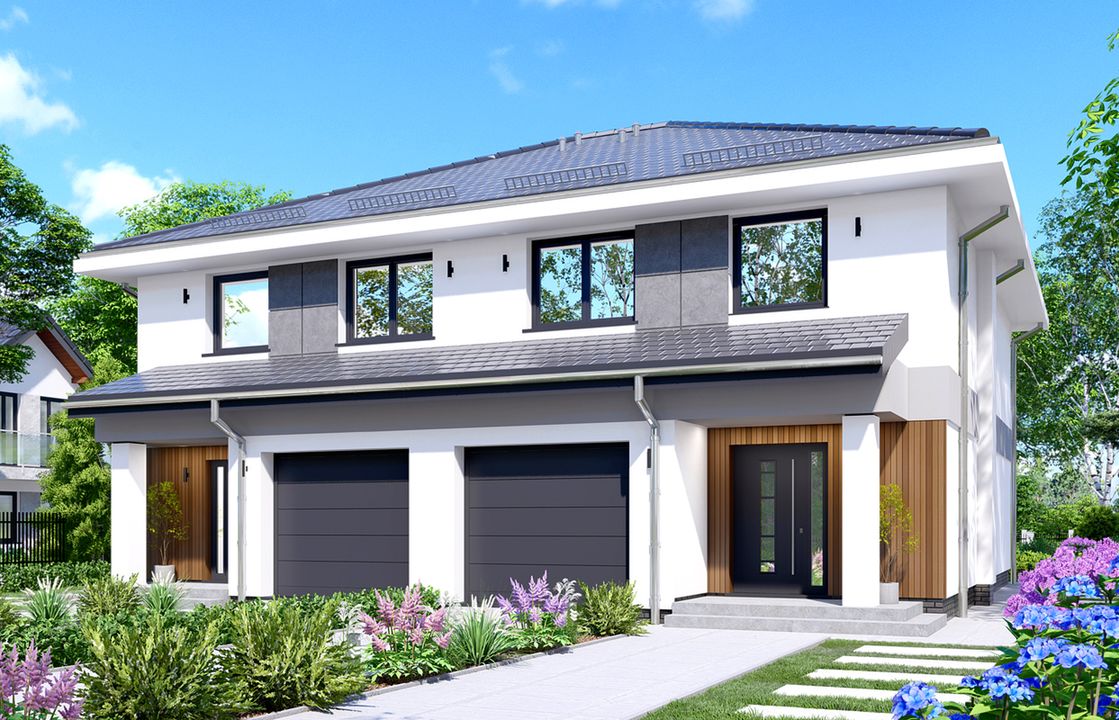 Ściany bloczki z betonu komórkowego+ ocieplenie; Strop parteru typu TERIVA; Pokrycie dachu dachówka lub blacha; Kąt nachylenia dachu 25, 20; Ocieplenie poddasza wełna mineralna; Tynk mineralny; Okna MS Okna; Brama garażowa Hormann;