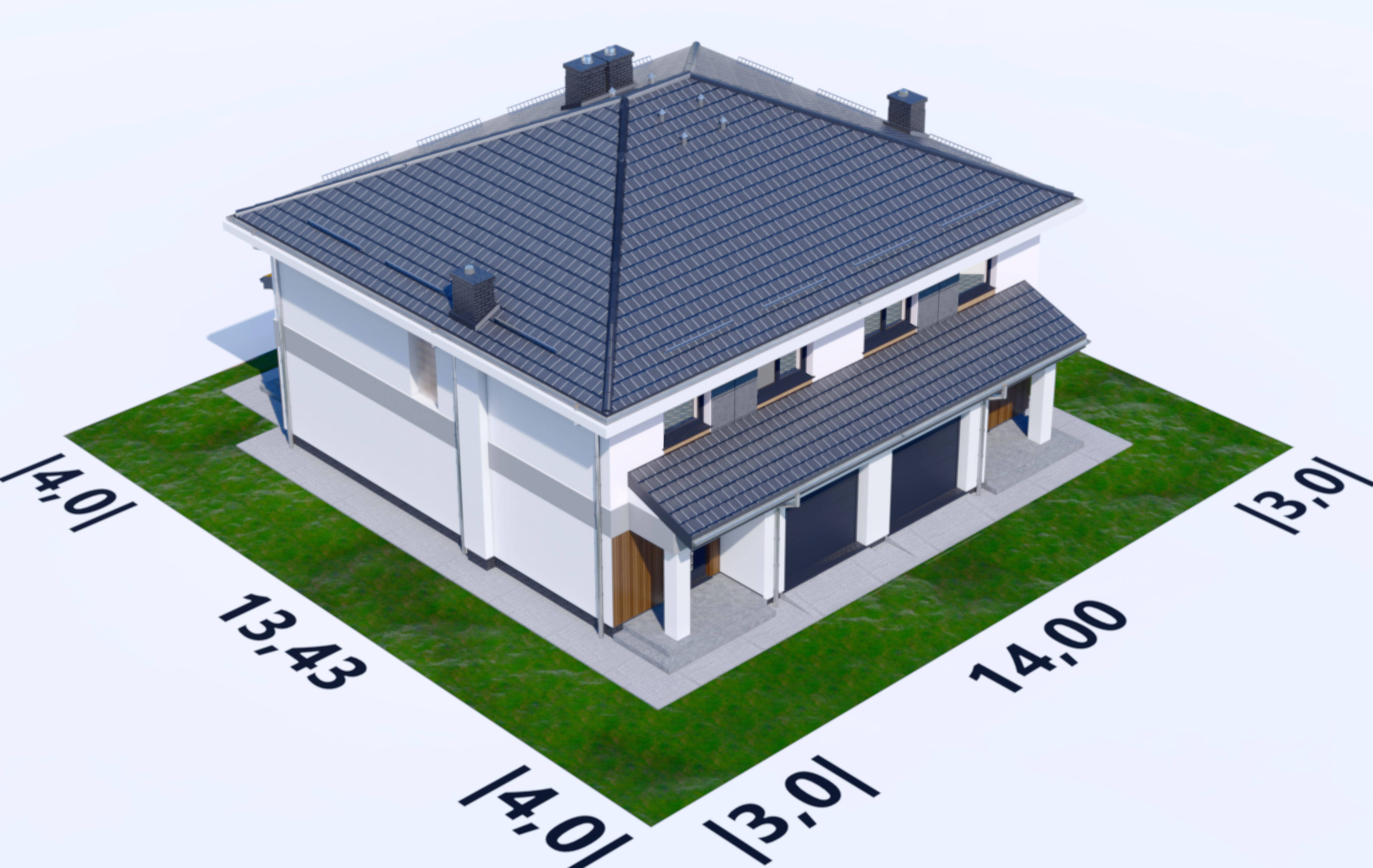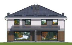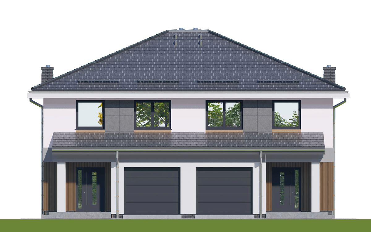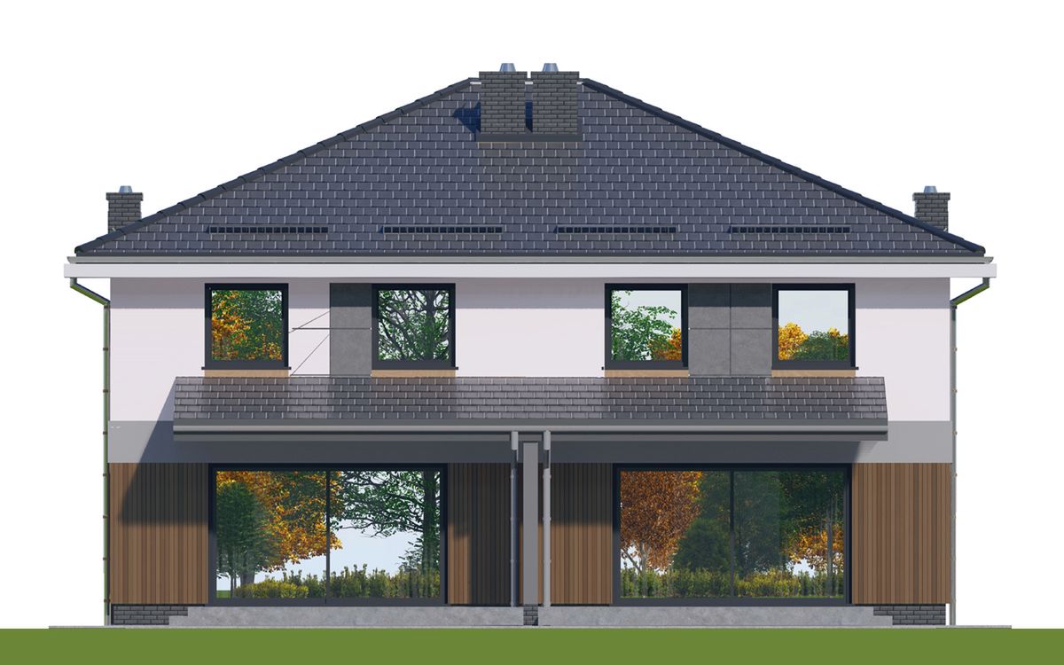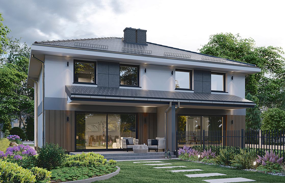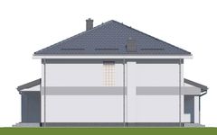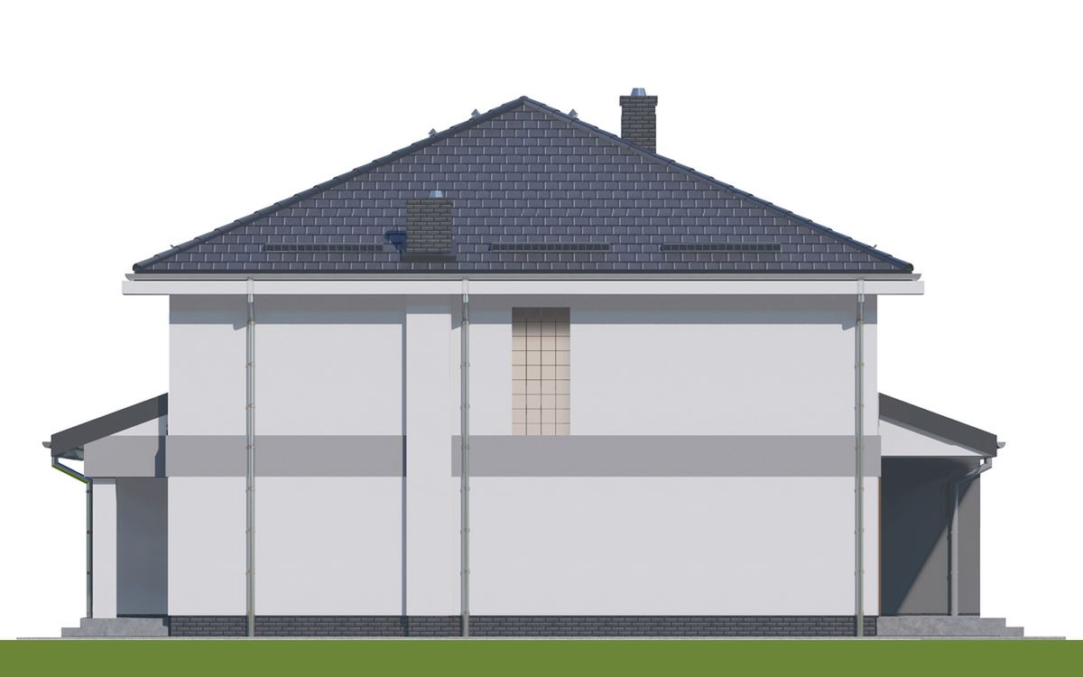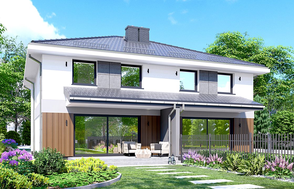 Graficzne opracowanie rzutów poglądowych widocznych na karcie projektu zostało wykonane przez Extradom.pl. Prezentowane przez Extradom.pl wizualizacje wykonane zostały przez autora projektu i należy poczytywać je jedynie za przykład i propozycję wykończenia, wizję architektoniczną autora projektu. Ostateczne wykończenie budynku może nastąpić na wiele sposobów. Szczegółowe rozwiązania zastosowane w oferowanej dokumentacji - w tym również ilość, lokalizacje i wygląd okien, drzwi, kominów - mogą w niewielkim stopniu różnić się od prezentowanej wizualizacji budynku.