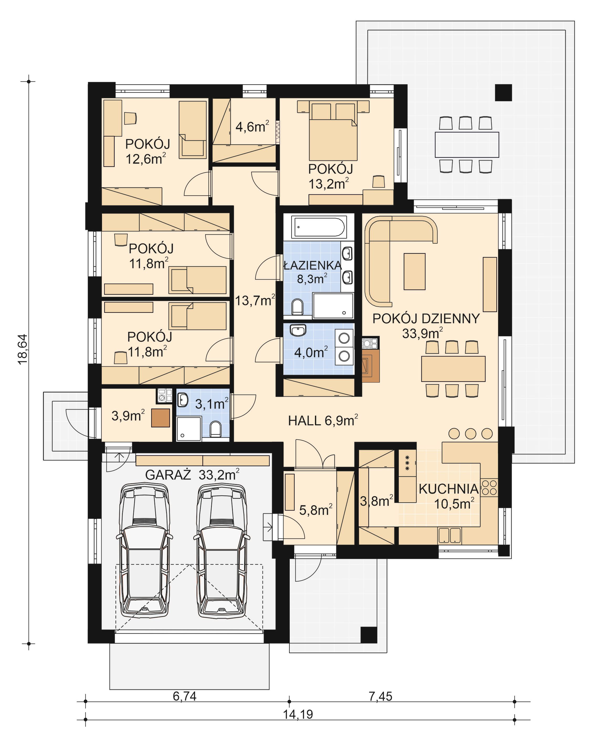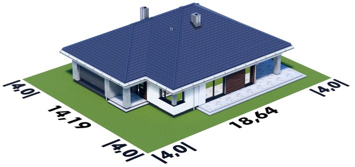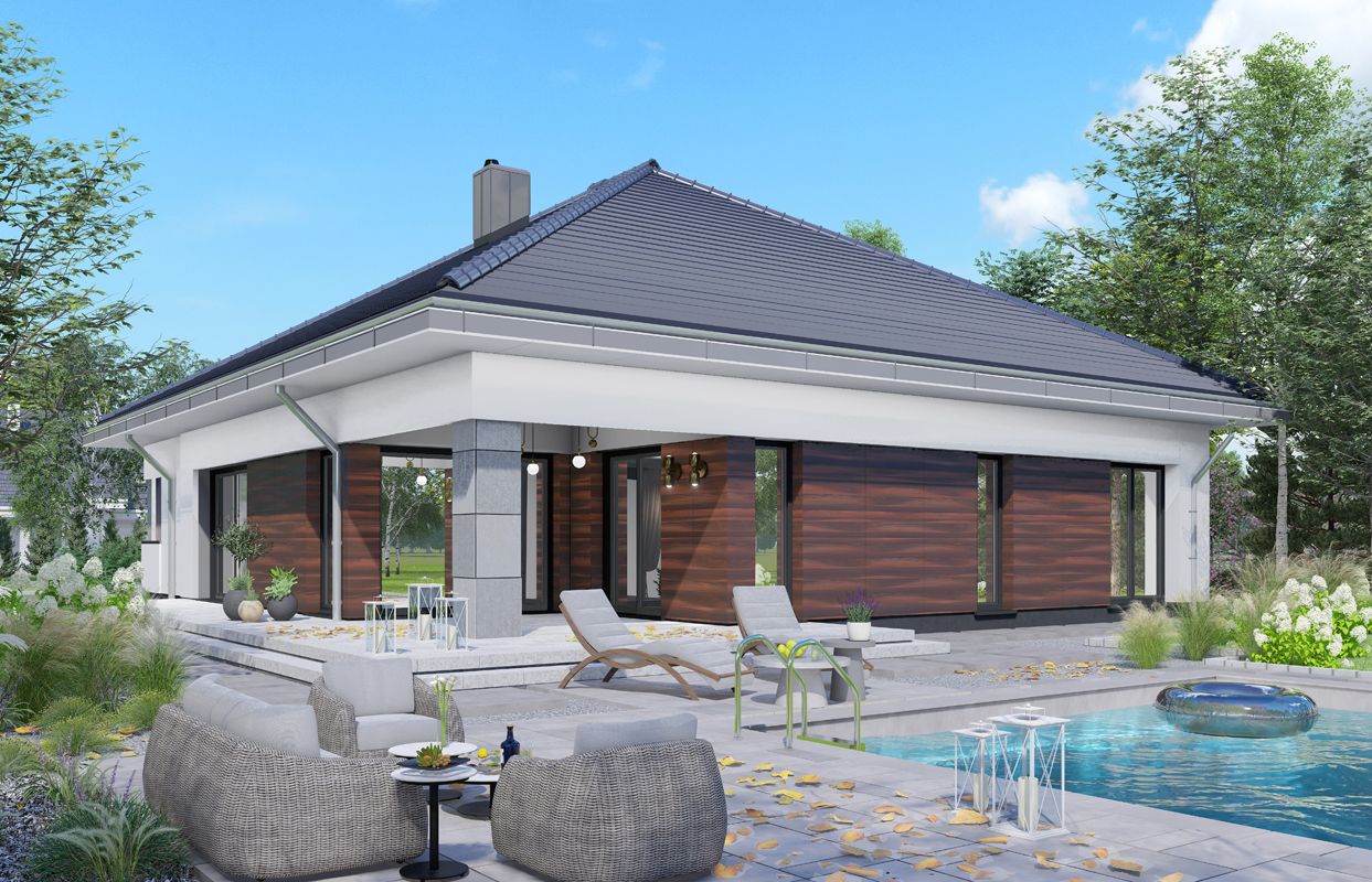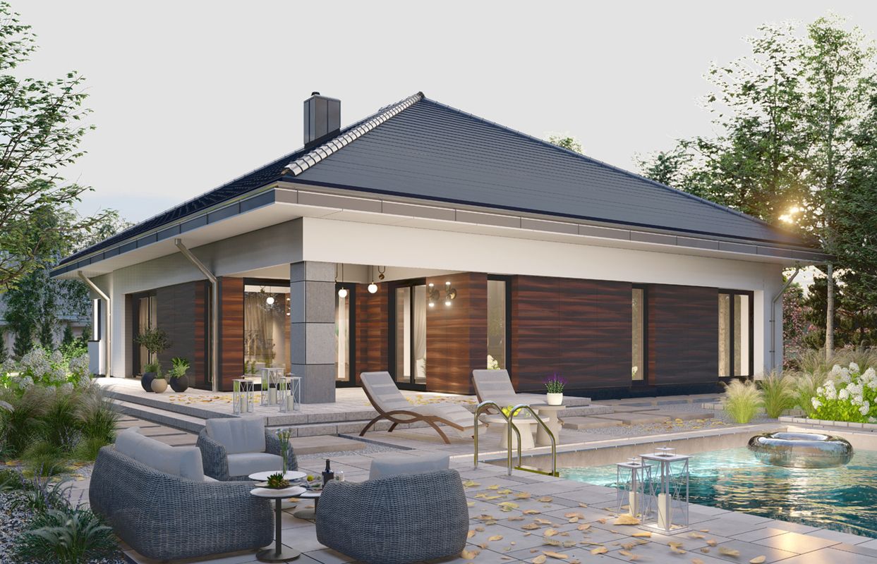 Graficzne opracowanie rzutów poglądowych widocznych na karcie projektu zostało wykonane przez Extradom.pl. Prezentowane przez Extradom.pl wizualizacje wykonane zostały przez autora projektu i należy poczytywać je jedynie za przykład i propozycję wykończenia, wizję architektoniczną autora projektu. Ostateczne wykończenie budynku może nastąpić na wiele sposobów. Szczegółowe rozwiązania zastosowane w oferowanej dokumentacji - w tym również ilość, lokalizacje i wygląd okien, drzwi, kominów - mogą w niewielkim stopniu różnić się od prezentowanej wizualizacji budynku.