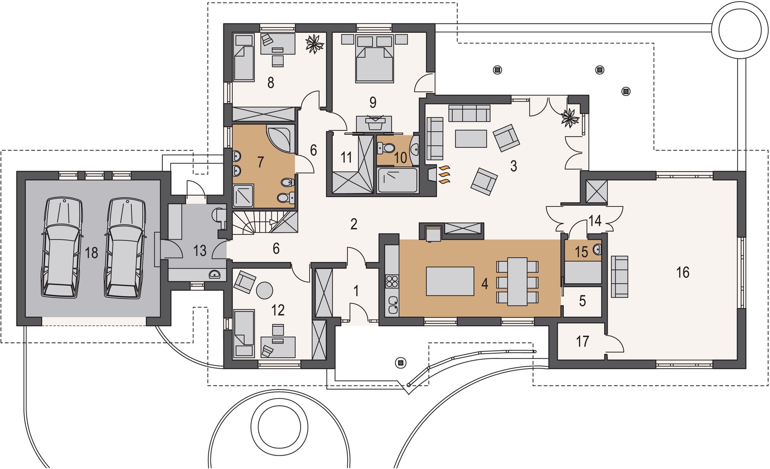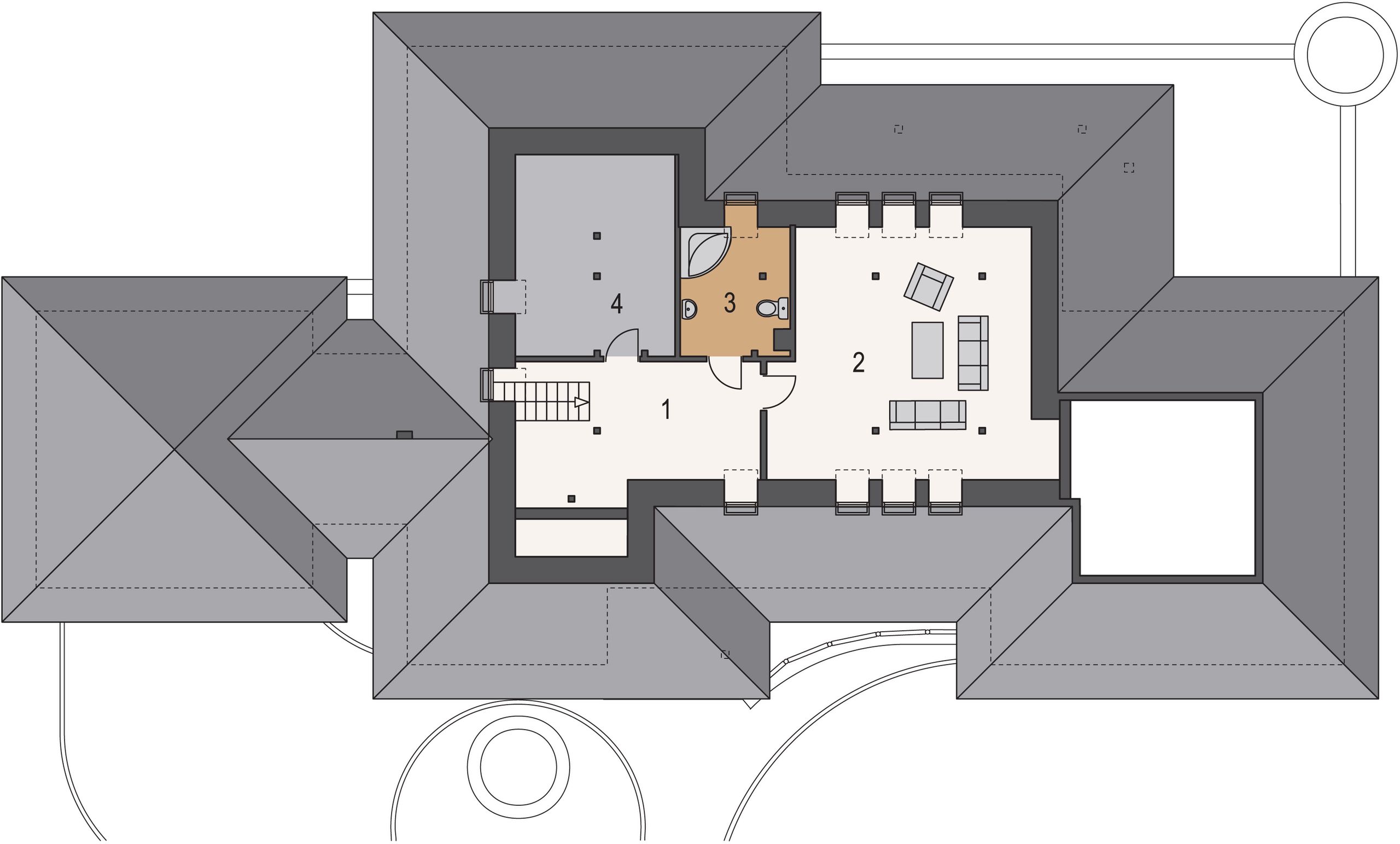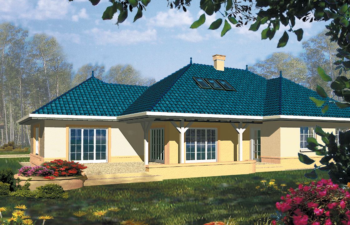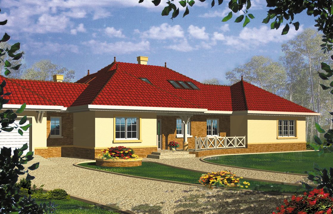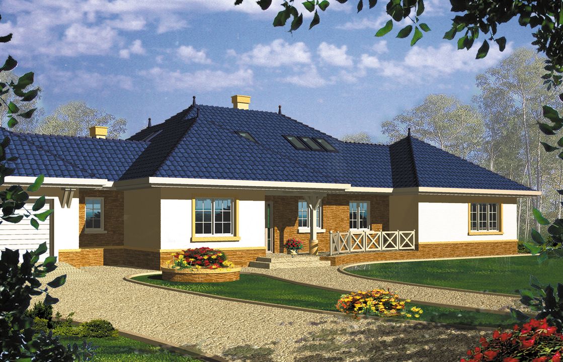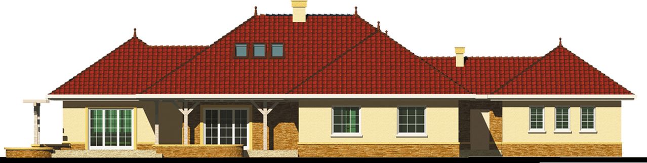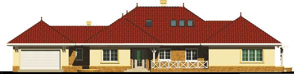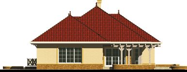 Graficzne opracowanie rzutów poglądowych widocznych na karcie projektu zostało wykonane przez Extradom.pl. Prezentowane przez Extradom.pl wizualizacje wykonane zostały przez autora projektu i należy poczytywać je jedynie za przykład i propozycję wykończenia, wizję architektoniczną autora projektu. Ostateczne wykończenie budynku może nastąpić na wiele sposobów. Szczegółowe rozwiązania zastosowane w oferowanej dokumentacji - w tym również ilość, lokalizacje i wygląd okien, drzwi, kominów - mogą w niewielkim stopniu różnić się od prezentowanej wizualizacji budynku.