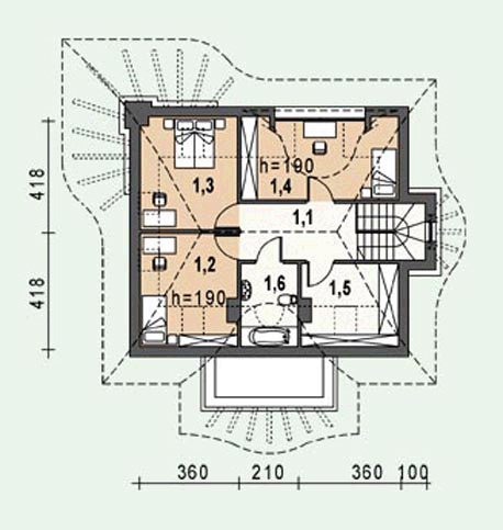 Graficzne opracowanie rzutów poglądowych widocznych na karcie projektu zostało wykonane przez Extradom.pl. Prezentowane przez Extradom.pl wizualizacje wykonane zostały przez autora projektu i należy poczytywać je jedynie za przykład i propozycję wykończenia, wizję architektoniczną autora projektu. Ostateczne wykończenie budynku może nastąpić na wiele sposobów. Szczegółowe rozwiązania zastosowane w oferowanej dokumentacji - w tym również ilość, lokalizacje i wygląd okien, drzwi, kominów - mogą w niewielkim stopniu różnić się od prezentowanej wizualizacji budynku.