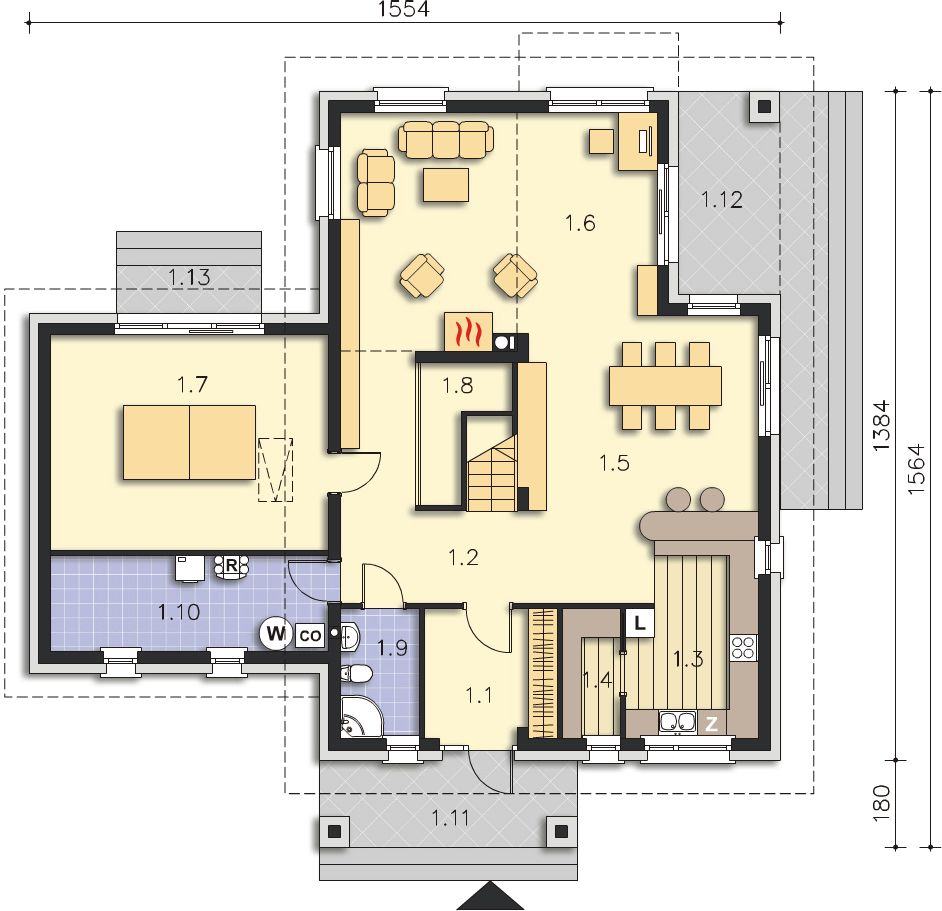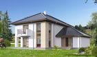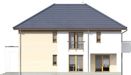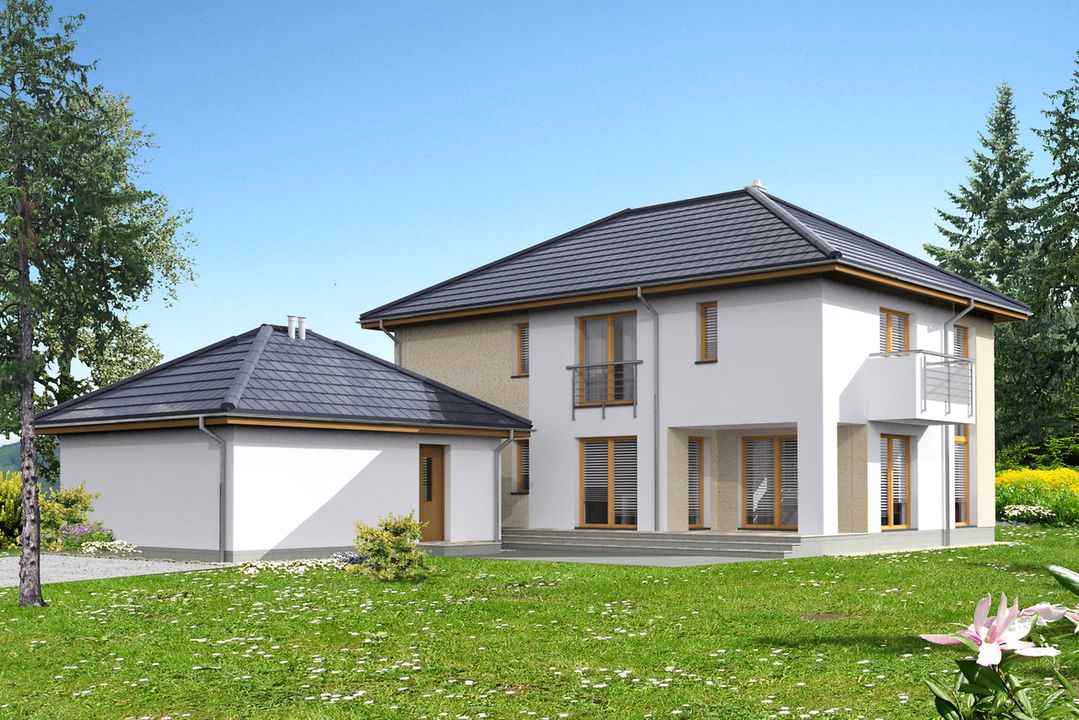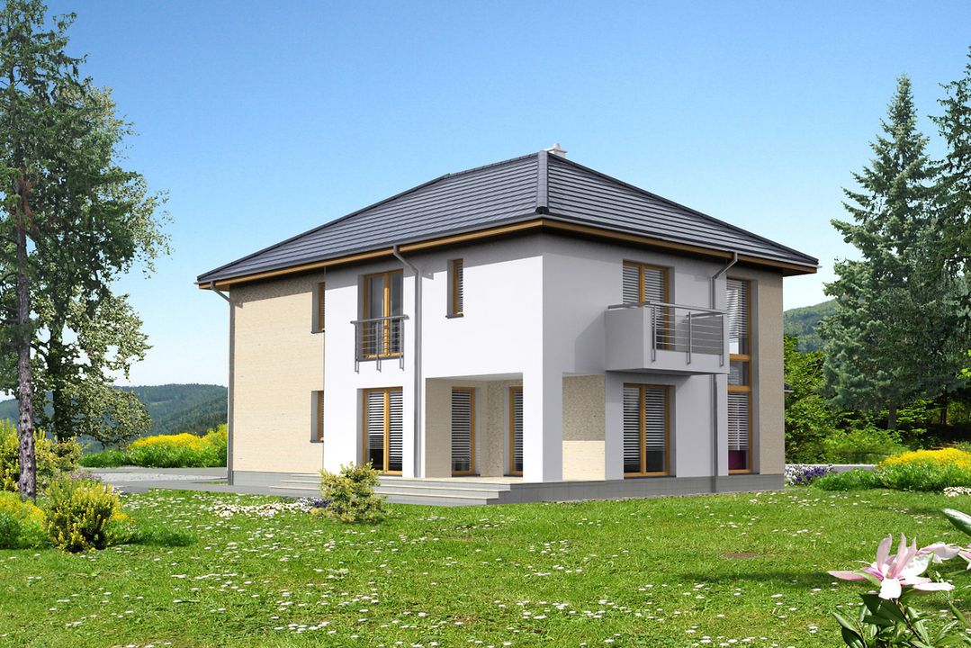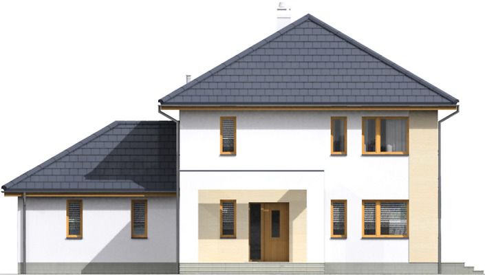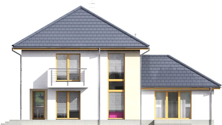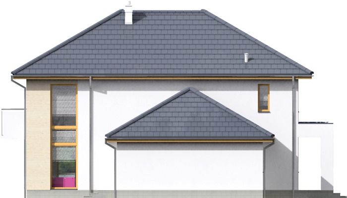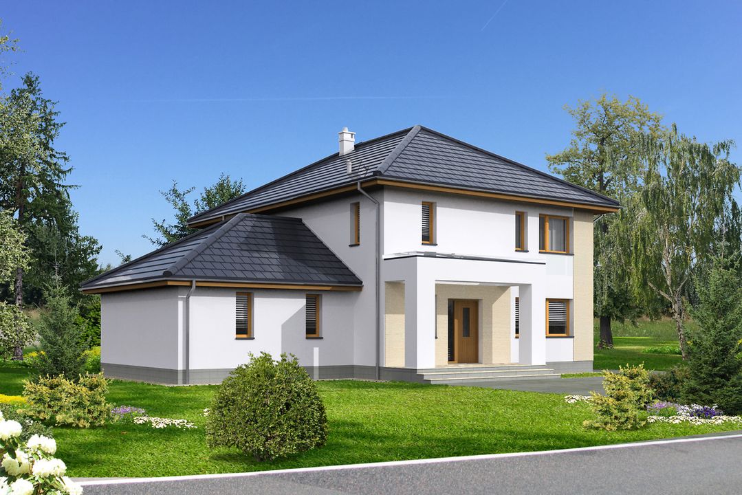 Graficzne opracowanie rzutów poglądowych widocznych na karcie projektu zostało wykonane przez Extradom.pl. Prezentowane przez Extradom.pl wizualizacje wykonane zostały przez autora projektu i należy poczytywać je jedynie za przykład i propozycję wykończenia, wizję architektoniczną autora projektu. Ostateczne wykończenie budynku może nastąpić na wiele sposobów. Szczegółowe rozwiązania zastosowane w oferowanej dokumentacji - w tym również ilość, lokalizacje i wygląd okien, drzwi, kominów - mogą w niewielkim stopniu różnić się od prezentowanej wizualizacji budynku.
