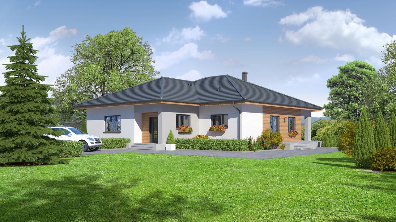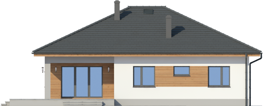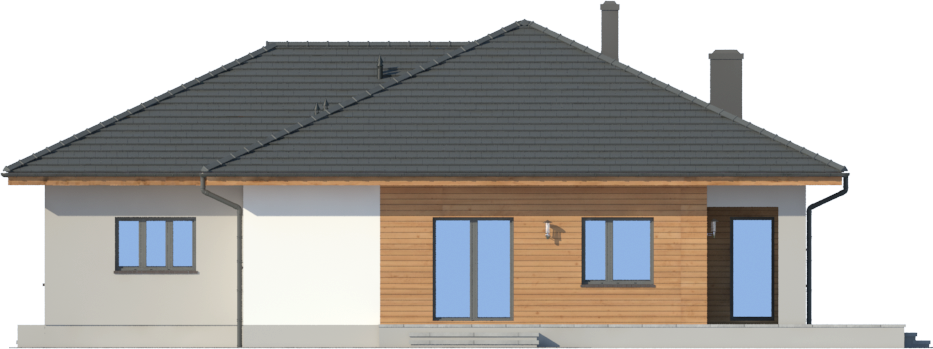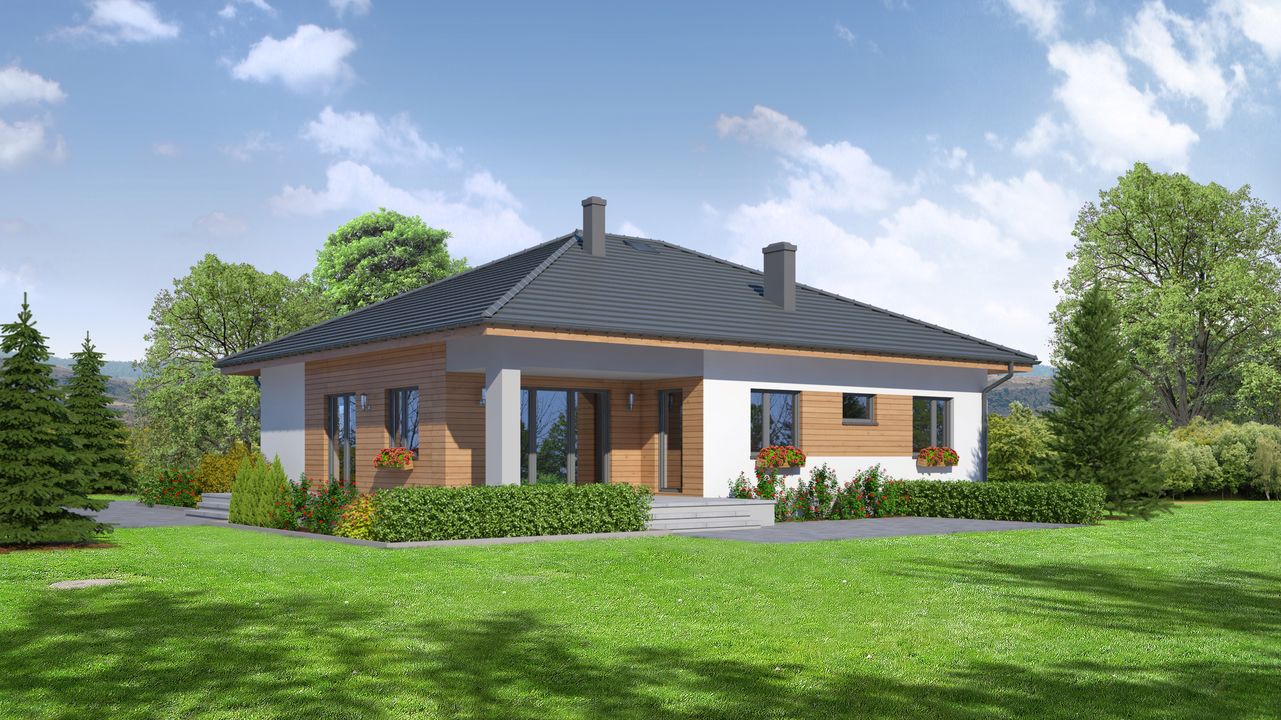 Graficzne opracowanie rzutów poglądowych widocznych na karcie projektu zostało wykonane przez Extradom.pl. Prezentowane przez Extradom.pl wizualizacje wykonane zostały przez autora projektu i należy poczytywać je jedynie za przykład i propozycję wykończenia, wizję architektoniczną autora projektu. Ostateczne wykończenie budynku może nastąpić na wiele sposobów. Szczegółowe rozwiązania zastosowane w oferowanej dokumentacji - w tym również ilość, lokalizacje i wygląd okien, drzwi, kominów - mogą w niewielkim stopniu różnić się od prezentowanej wizualizacji budynku.