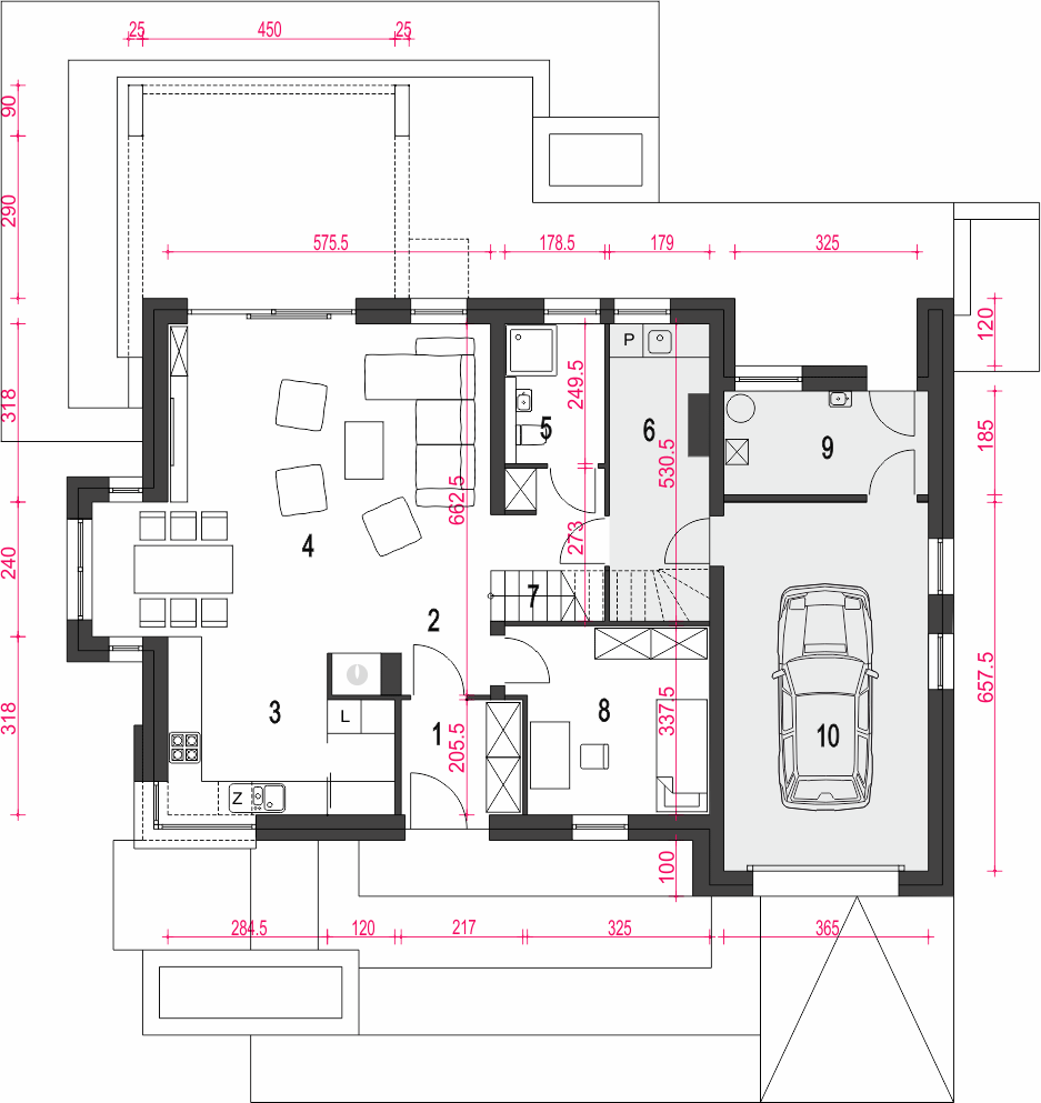 Fundamenty: betonowe. Ściany zewnętrzne: porotherm+styropian termo organika. Rodzaj stropu: teriva i. Elewacje: tynk strukturalny, okładzina hpl drewnopodobna. Pokrycie dachu: dachówka cem. lub cer.