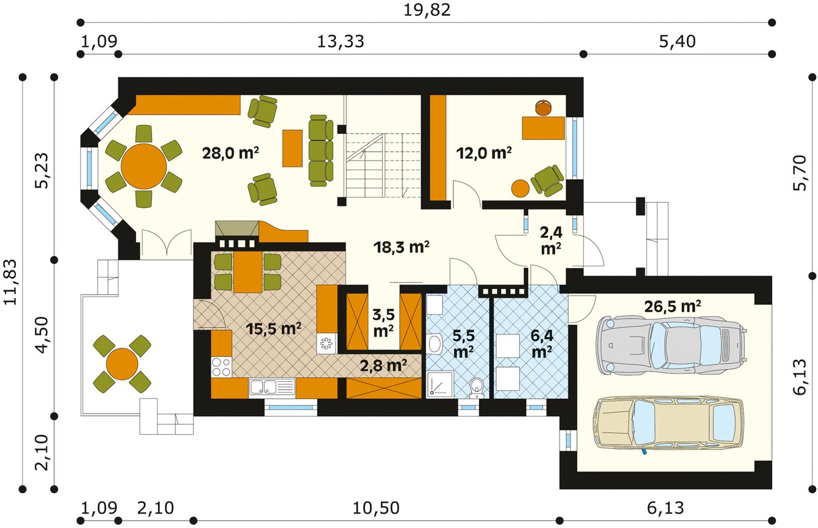 Dach: dachówka, kąt nachylenia 33°. Stropy: żelbetowe, wylewane. Ściany: 3-warstwowe - pustak ceramiczny + styropian. Ogrzewanie: gazowe, olejowe.