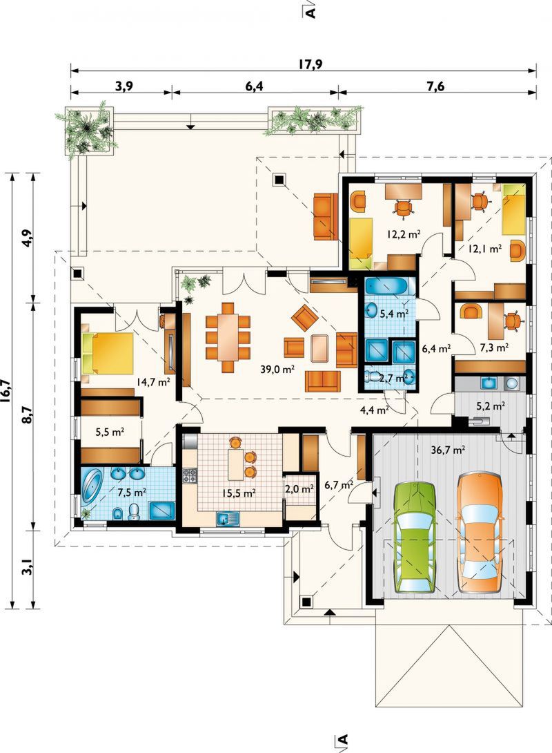 Graficzne opracowanie rzutów poglądowych widocznych na karcie projektu zostało wykonane przez Extradom.pl. Prezentowane przez Extradom.pl wizualizacje wykonane zostały przez autora projektu i należy poczytywać je jedynie za przykład i propozycję wykończenia, wizję architektoniczną autora projektu. Ostateczne wykończenie budynku może nastąpić na wiele sposobów. Szczegółowe rozwiązania zastosowane w oferowanej dokumentacji - w tym również ilość, lokalizacje i wygląd okien, drzwi, kominów - mogą w niewielkim stopniu różnić się od prezentowanej wizualizacji budynku.