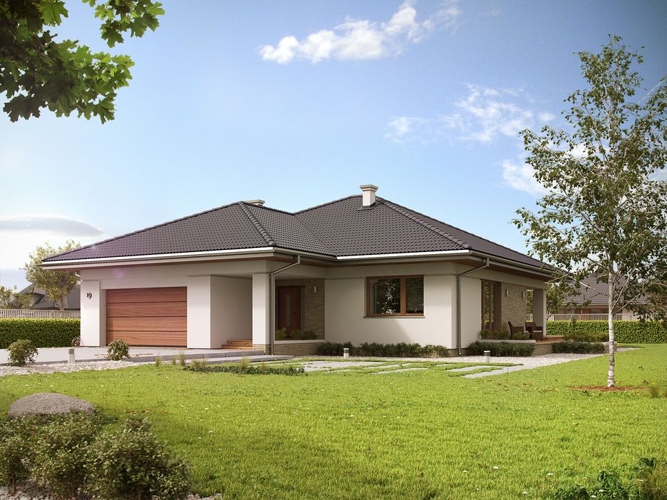 Ściany: 2-warstwowe - bloczek z betonu komórkowego SOLBET 24 cm + styropian Termo Organika. Stropy: System Stropowy TECHNOBETON. Dach: dachówka ceramiczna CREATON, kąt nachylenia 25° i 30°. Dostępna wersja kąt 30°. Ogrzewanie: gazowe, na paliwo stałe. Stolarka: brama garażowa i drzwi zewnętrzne Hörmann.