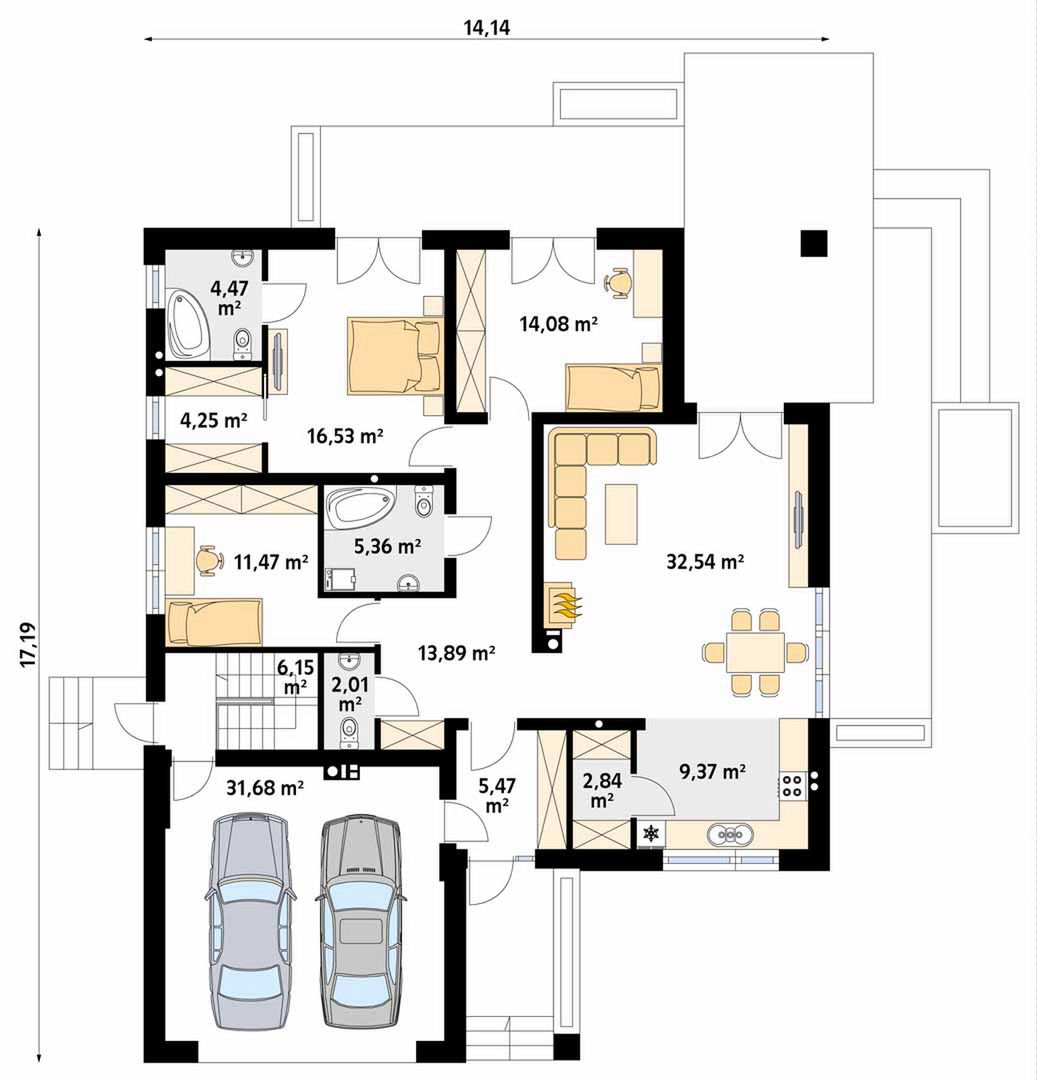 Graficzne opracowanie rzutów poglądowych widocznych na karcie projektu zostało wykonane przez Extradom.pl. Prezentowane przez Extradom.pl wizualizacje wykonane zostały przez autora projektu i należy poczytywać je jedynie za przykład i propozycję wykończenia, wizję architektoniczną autora projektu. Ostateczne wykończenie budynku może nastąpić na wiele sposobów. Szczegółowe rozwiązania zastosowane w oferowanej dokumentacji - w tym również ilość, lokalizacje i wygląd okien, drzwi, kominów - mogą w niewielkim stopniu różnić się od prezentowanej wizualizacji budynku.