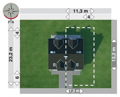 Graficzne opracowanie rzutów poglądowych widocznych na karcie projektu zostało wykonane przez Extradom.pl. Prezentowane przez Extradom.pl wizualizacje wykonane zostały przez autora projektu i należy poczytywać je jedynie za przykład i propozycję wykończenia, wizję architektoniczną autora projektu. Ostateczne wykończenie budynku może nastąpić na wiele sposobów. Szczegółowe rozwiązania zastosowane w oferowanej dokumentacji - w tym również ilość, lokalizacje i wygląd okien, drzwi, kominów - mogą w niewielkim stopniu różnić się od prezentowanej wizualizacji budynku.