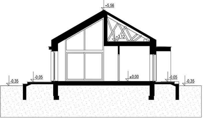 Wersja technologiczna: murowana - beton komórkowy. Konstrukcja dachu: prefabrykowane wiązary drewniane MITEK Industries Polska. Pokrycie dachowe: Zintegrowany system - dachowo rynnowy DACHRYNNA z panelem na rąbek modułowy GRIN MOD. Typ schodów: brak. Strop: dolny pas wiązarów MITEK. Typ ogrzewania: Kocioł na gaz. Dostępna wersja z pompą ciepła: Tak. Dostępna wersja z fotowoltaiką: Tak. Wentylacja: mechaniczna. Ściany zewnętrzne: 24 cm beton komórkowy Solbet Optimal. Ściany wewnętrzne działowe: 12 cm beton komórkowy Solbet One. Wentylacja: mechaniczna Heatpex Aria.