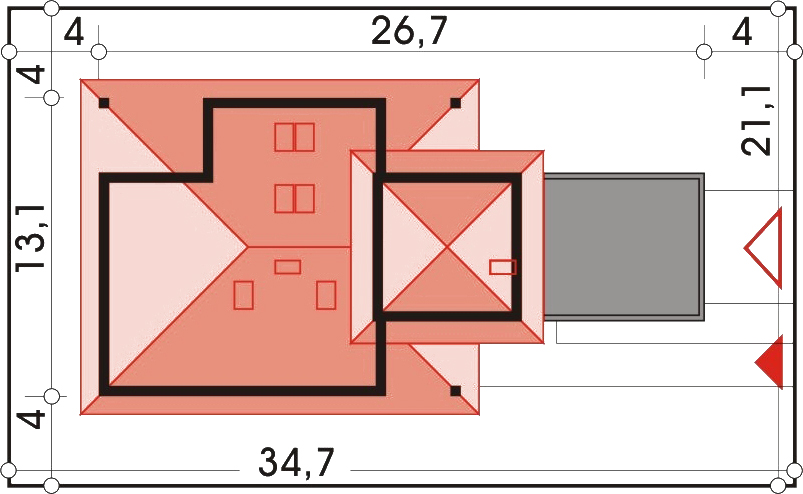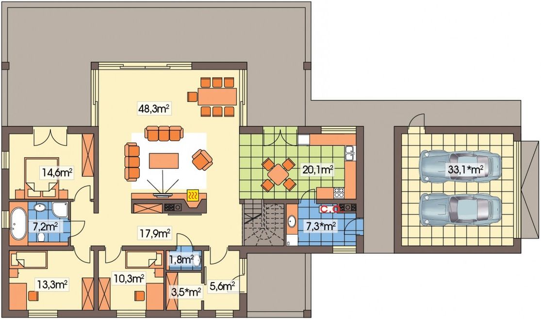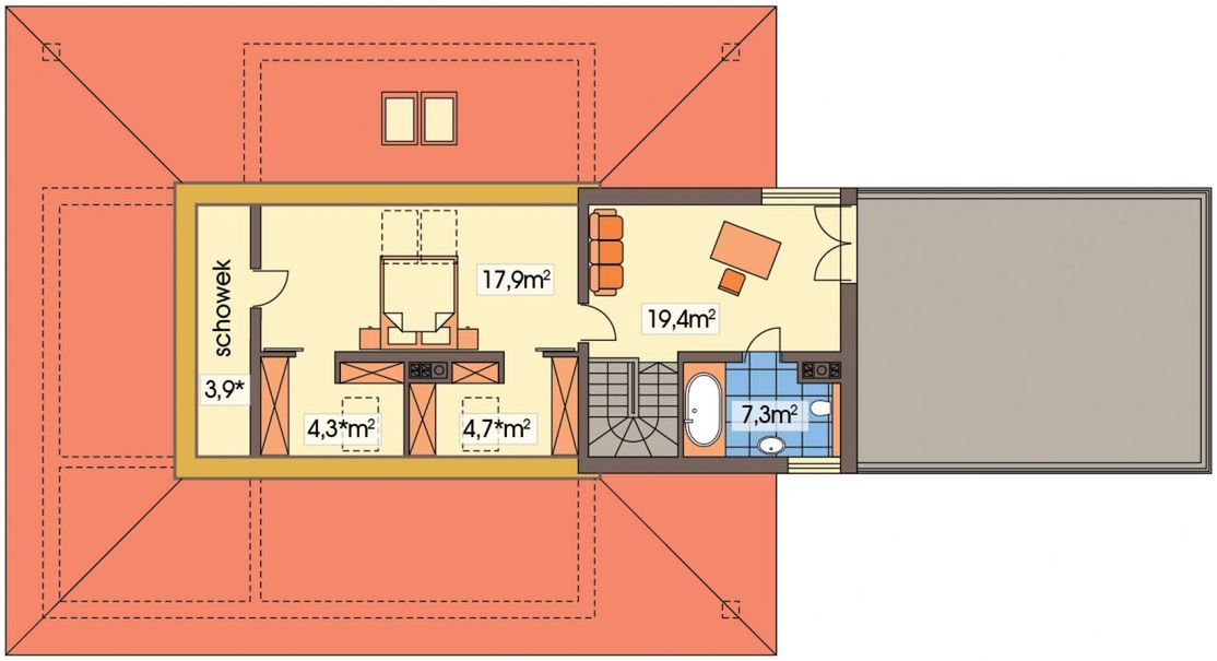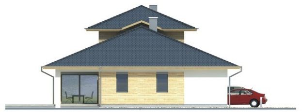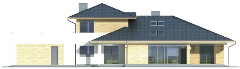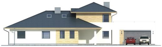 Graficzne opracowanie rzutów poglądowych widocznych na karcie projektu zostało wykonane przez Extradom.pl. Prezentowane przez Extradom.pl wizualizacje wykonane zostały przez autora projektu i należy poczytywać je jedynie za przykład i propozycję wykończenia, wizję architektoniczną autora projektu. Ostateczne wykończenie budynku może nastąpić na wiele sposobów. Szczegółowe rozwiązania zastosowane w oferowanej dokumentacji - w tym również ilość, lokalizacje i wygląd okien, drzwi, kominów - mogą w niewielkim stopniu różnić się od prezentowanej wizualizacji budynku.