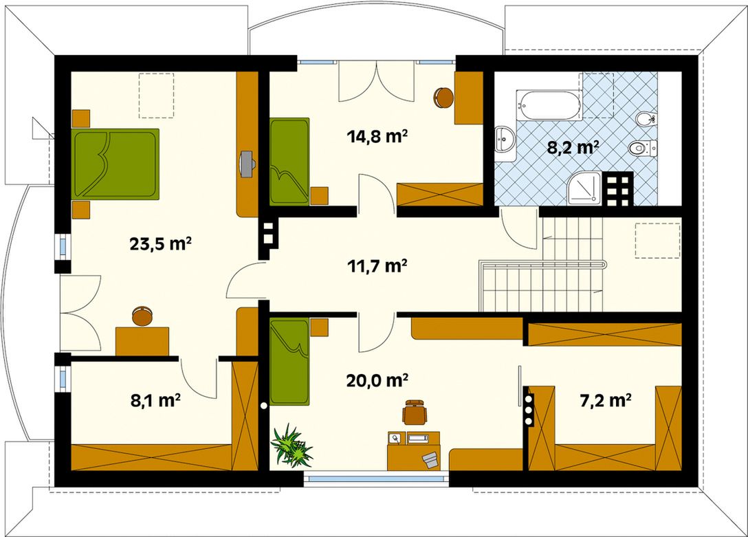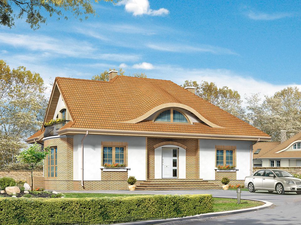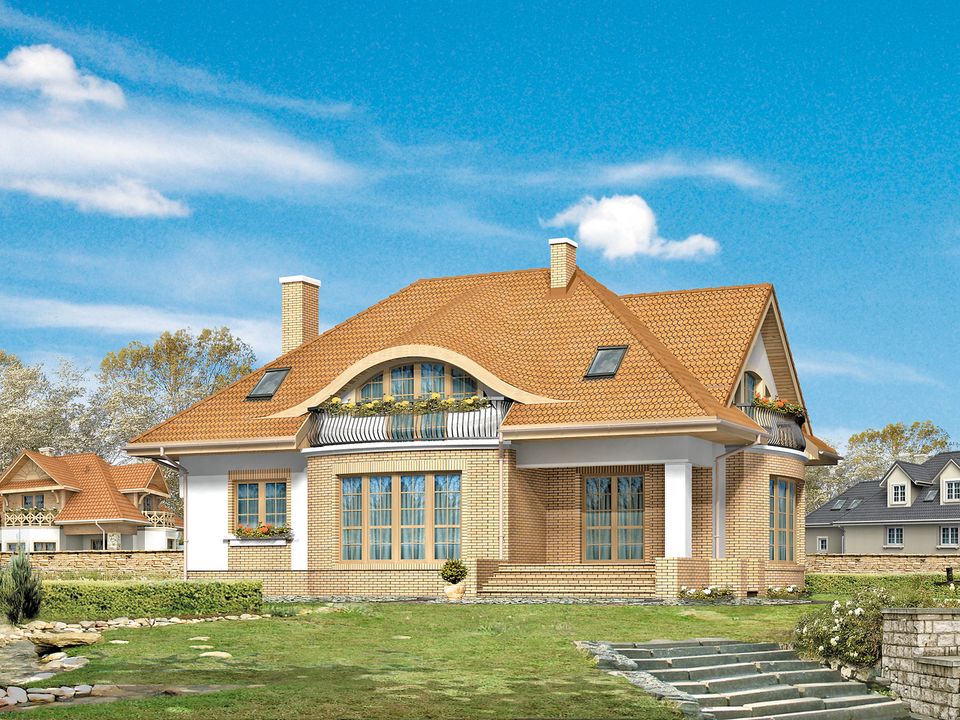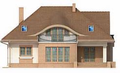 Graficzne opracowanie rzutów poglądowych widocznych na karcie projektu zostało wykonane przez Extradom.pl. Prezentowane przez Extradom.pl wizualizacje wykonane zostały przez autora projektu i należy poczytywać je jedynie za przykład i propozycję wykończenia, wizję architektoniczną autora projektu. Ostateczne wykończenie budynku może nastąpić na wiele sposobów. Szczegółowe rozwiązania zastosowane w oferowanej dokumentacji - w tym również ilość, lokalizacje i wygląd okien, drzwi, kominów - mogą w niewielkim stopniu różnić się od prezentowanej wizualizacji budynku.