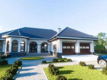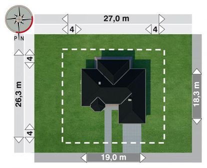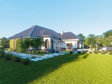Graficzne opracowanie rzutów poglądowych widocznych na karcie projektu zostało wykonane przez Extradom.pl. Prezentowane przez Extradom.pl wizualizacje wykonane zostały przez autora projektu i należy poczytywać je jedynie za przykład i propozycję wykończenia, wizję architektoniczną autora projektu. Ostateczne wykończenie budynku może nastąpić na wiele sposobów. Szczegółowe rozwiązania zastosowane w oferowanej dokumentacji - w tym również ilość, lokalizacje i wygląd okien, drzwi, kominów - mogą w niewielkim stopniu różnić się od prezentowanej wizualizacji budynku.